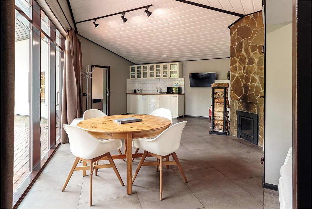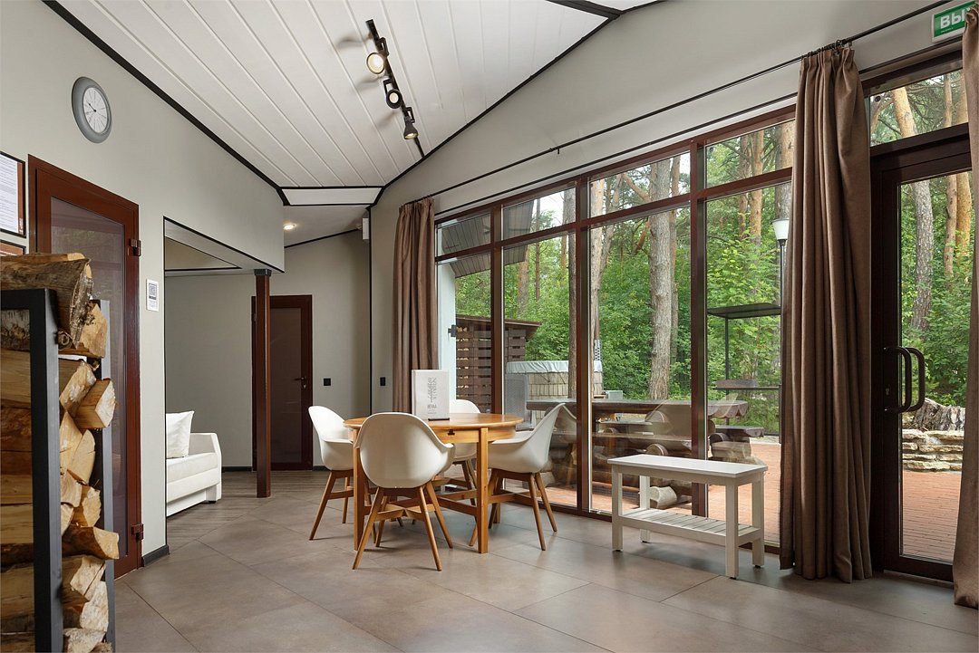 телевизор, Wi-Fi, холодильник, светильник, фен, плита для приготовления пищи, микроволновая печь, душевая кабина, санузел, банные принадлежности, банные полотенца, тапочки, сауна, терраса, двуспальная кровать, тумбы, стулья, шкаф для одежды, вешалки, обеденный стол, багажная тумба, кухня, чайный набор, набор посуды, посудомоечная машина, чайник, раковина, обеденная зона, гостиная зона, отопление, отдельный вход в номер, высокие потолки, кухонная посуда, стаканы, кухонная утварь, столовые приборы, стол, туалетные средства, туалет, мангал, принадлежности для барбекю, панорамные окна, сушилка для белья, раскладной диван, внутренний телефон, теплые полы, вид на лес, мыло, можно с питомцамиВ коттедже