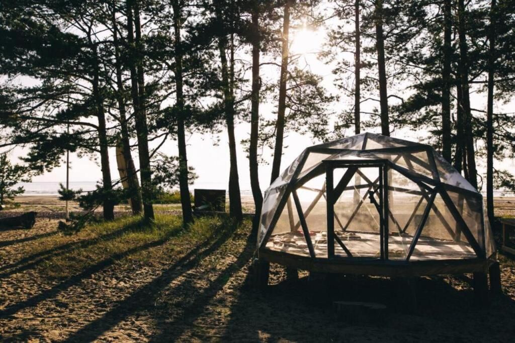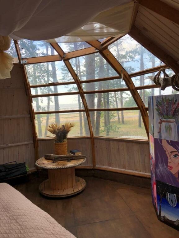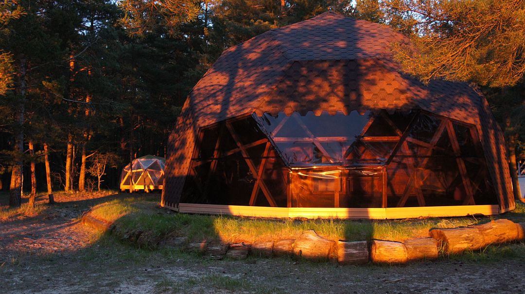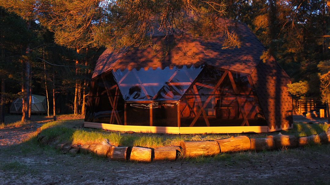 Прозрачная сфера со шторами – это уютная стационарная палатка. Размещение походное пенка и спальный мешок. Пенка входит в стоимость, а спальный мешок вы можете арендовать на базе. Есть мангальная зона.