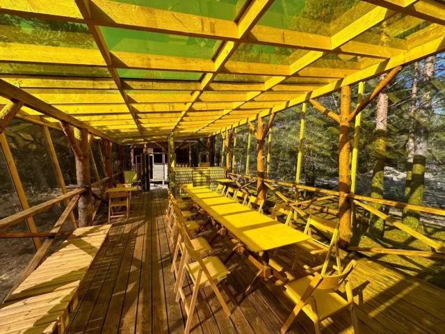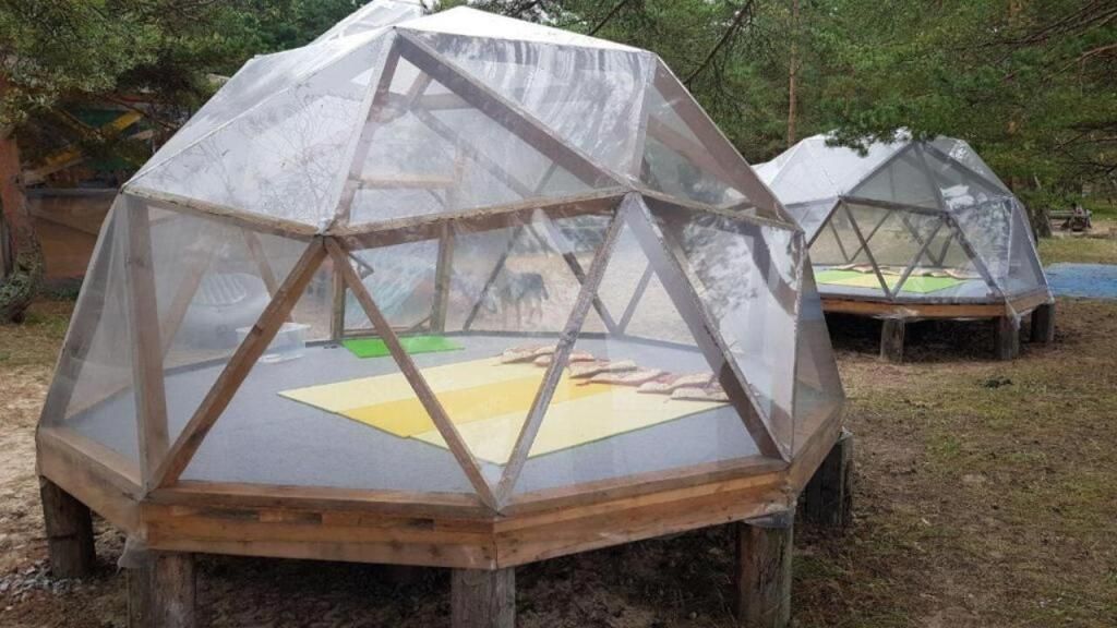 Прозрачная сфера со шторами — это уютная стационарная палатка. Размещение походное пенка и спальный мешок. Пенка входит в стоимость, а спальный мешок вы можете арендовать на базе. Есть мангальная зона.