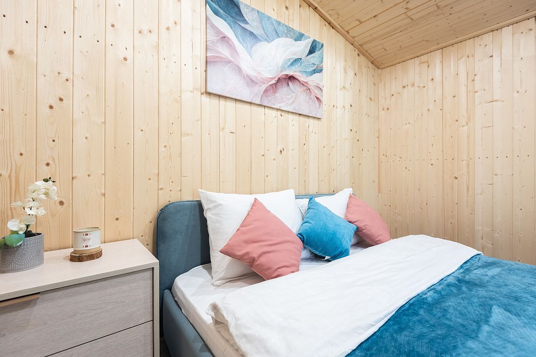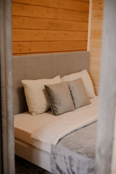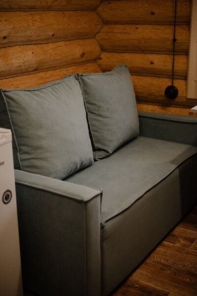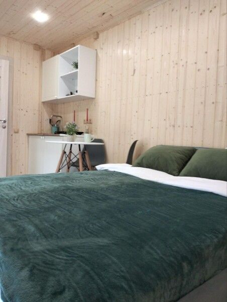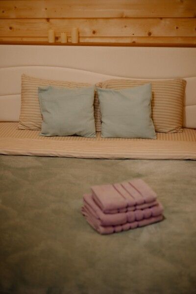 - Двуспальная кровать с постельным бельем и диван для комфортного размещения;