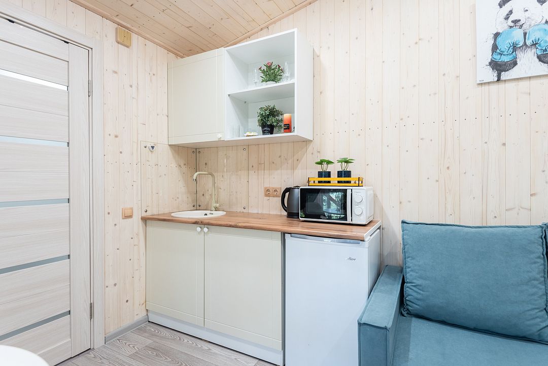- Полностью оборудованная кухня с посудой, столовыми приборами, электрической плиткой, чайником, холодильником и микроволновой печью;