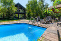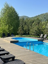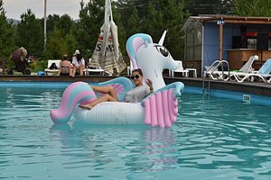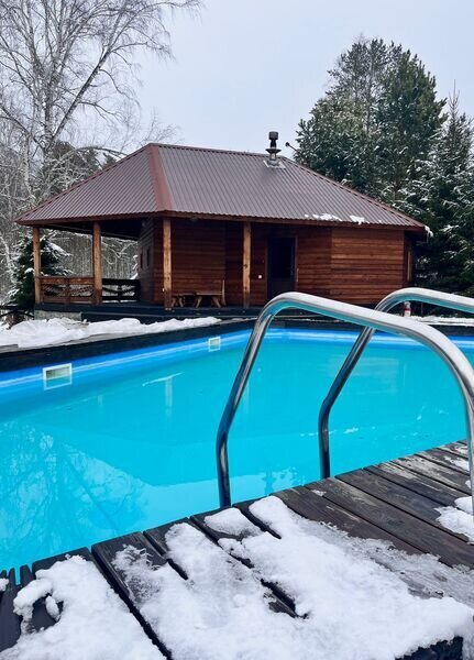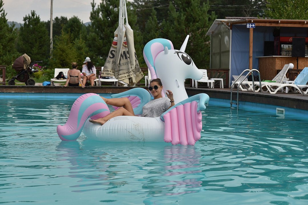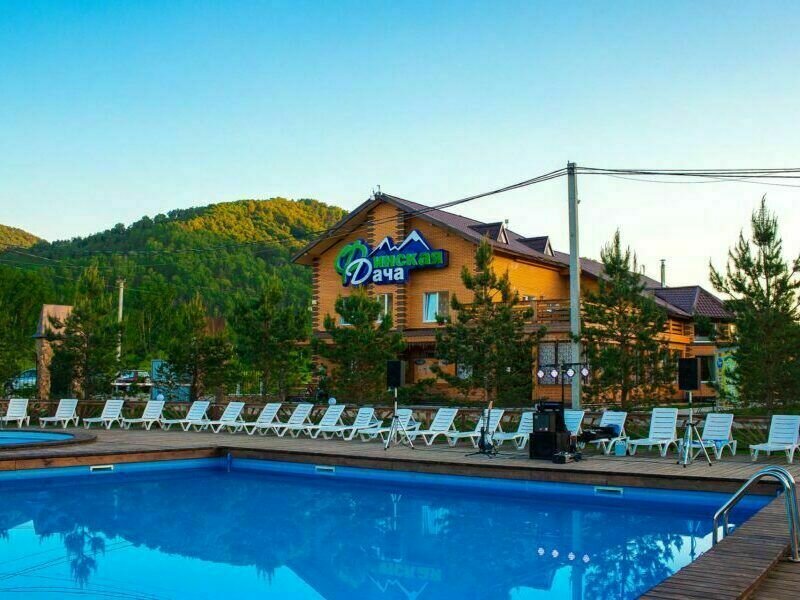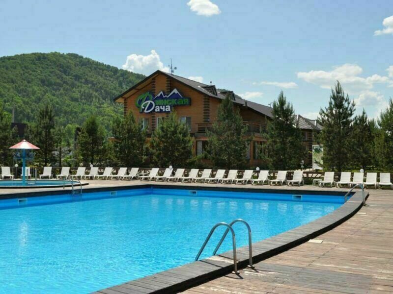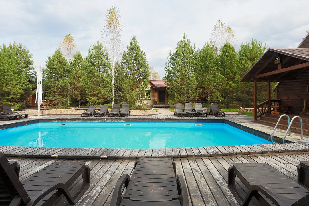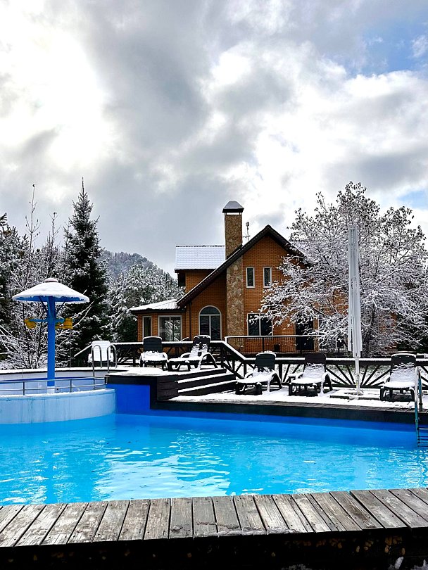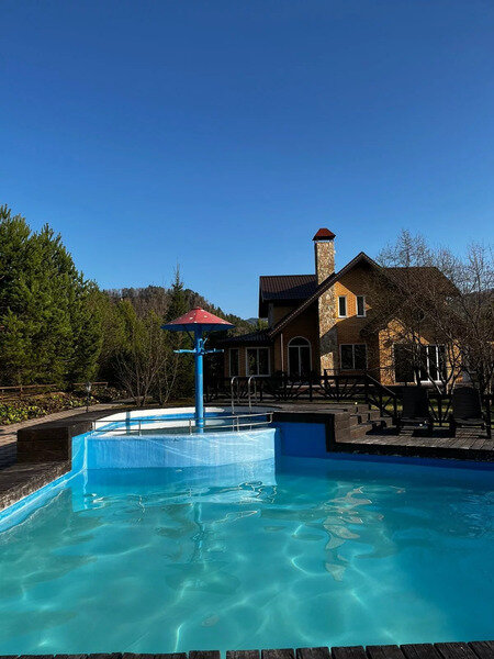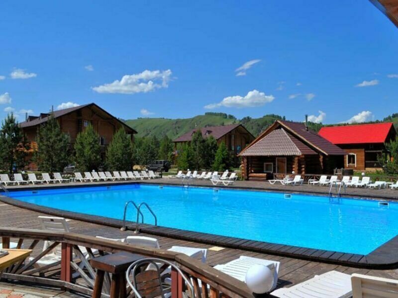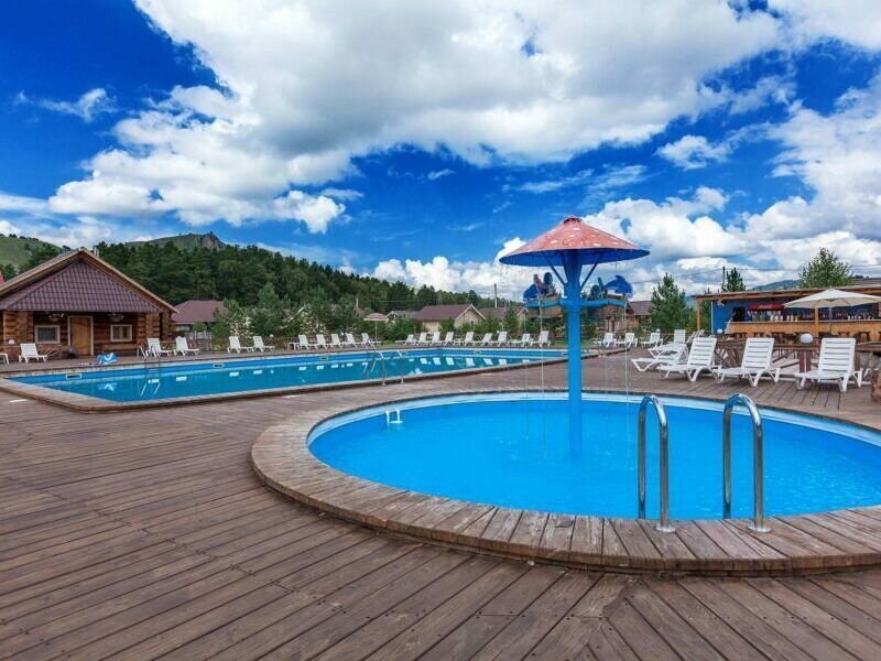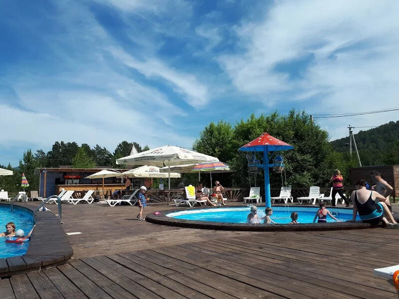 Открытый подогреваемый бассейн с пляжной зоной. Проход к берегу Катуни через общий выход.