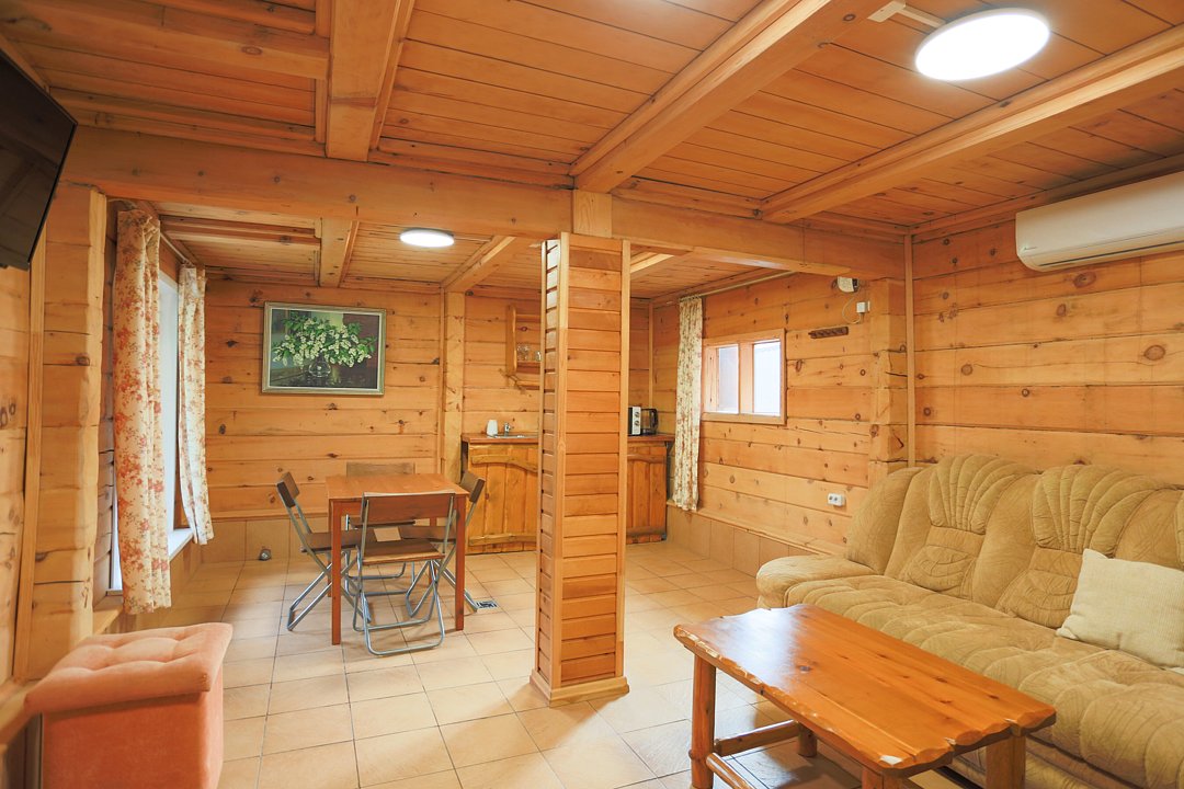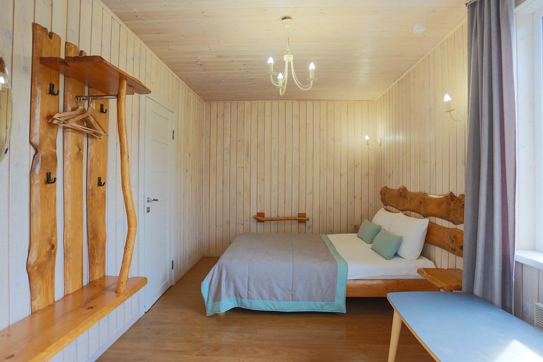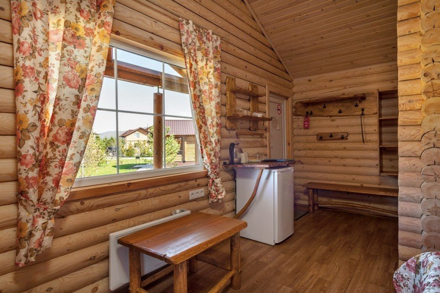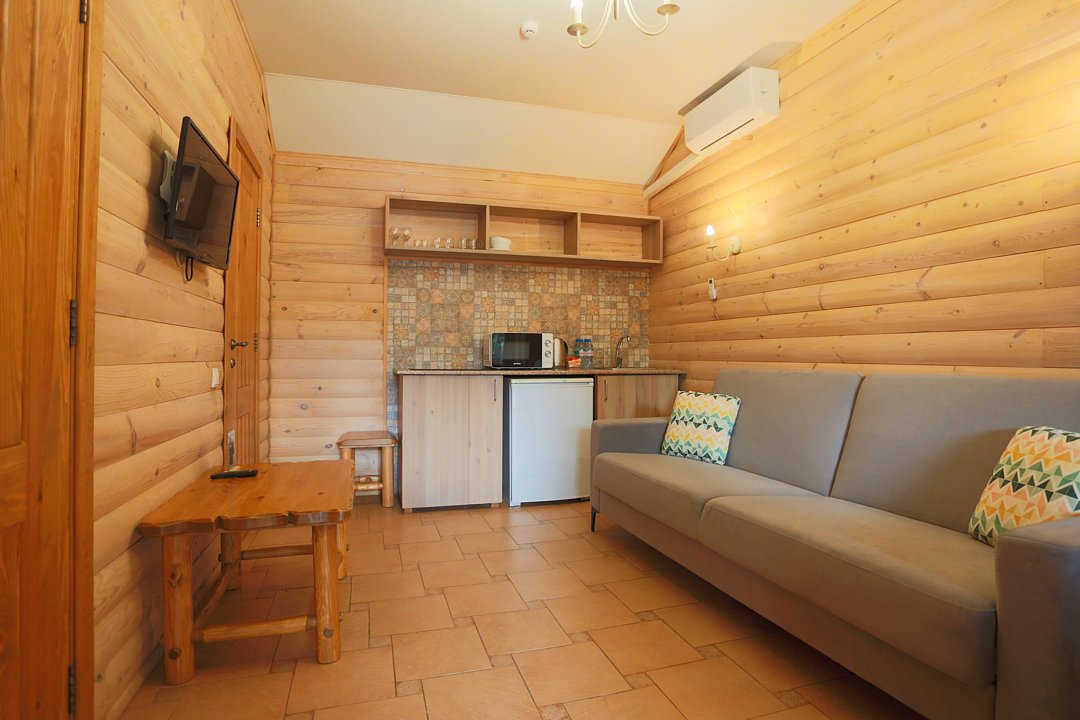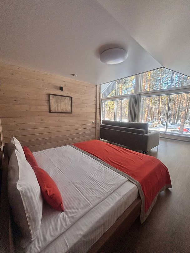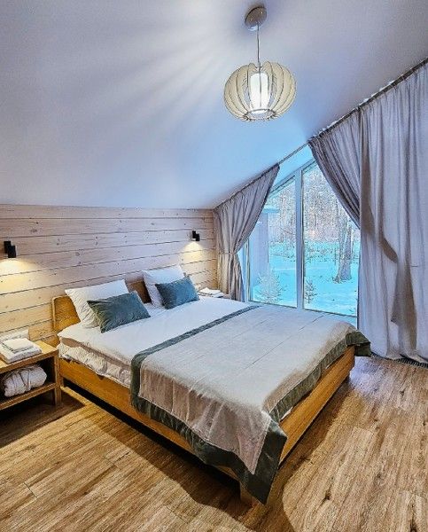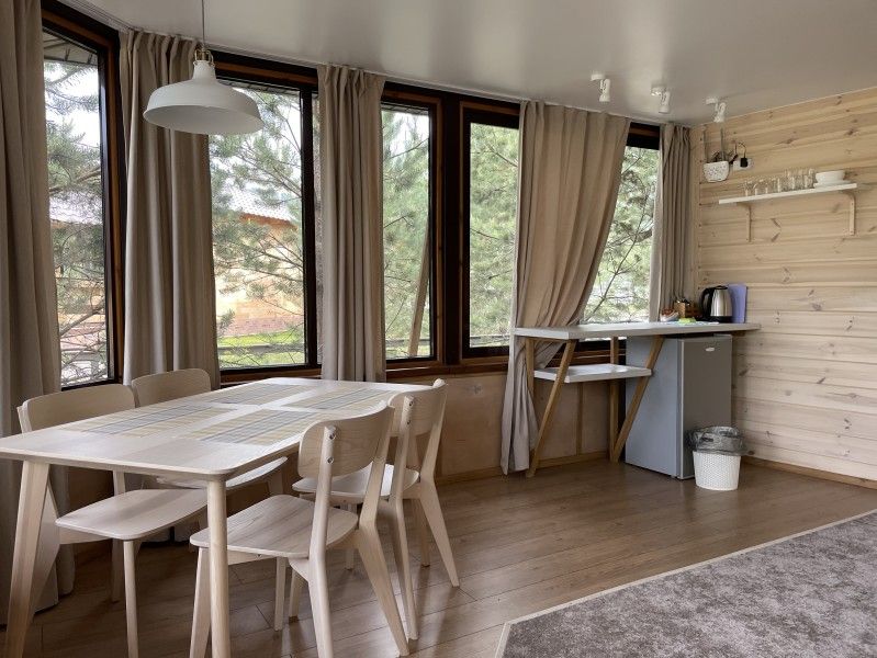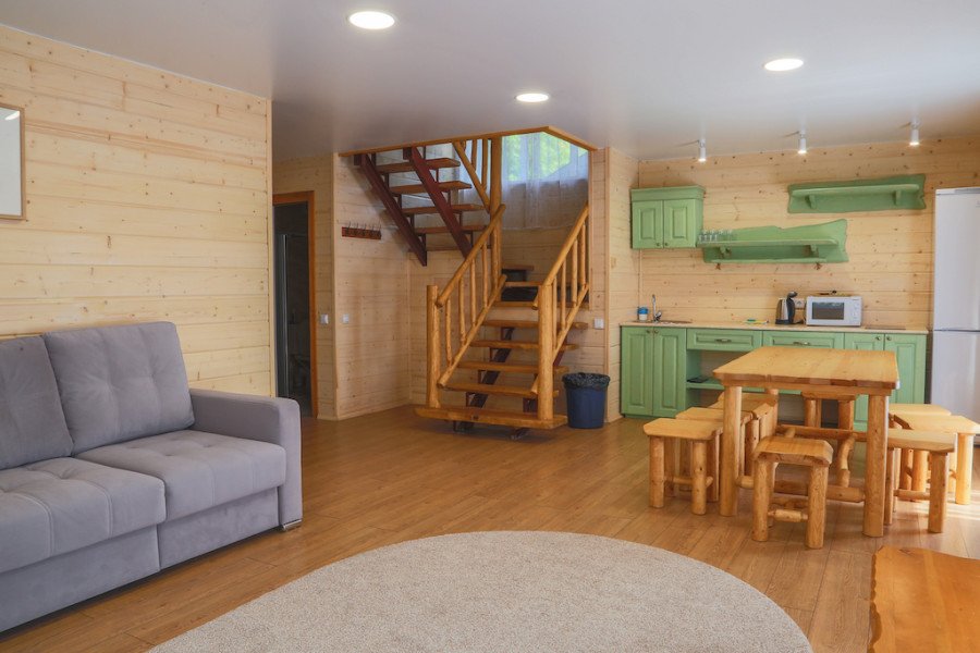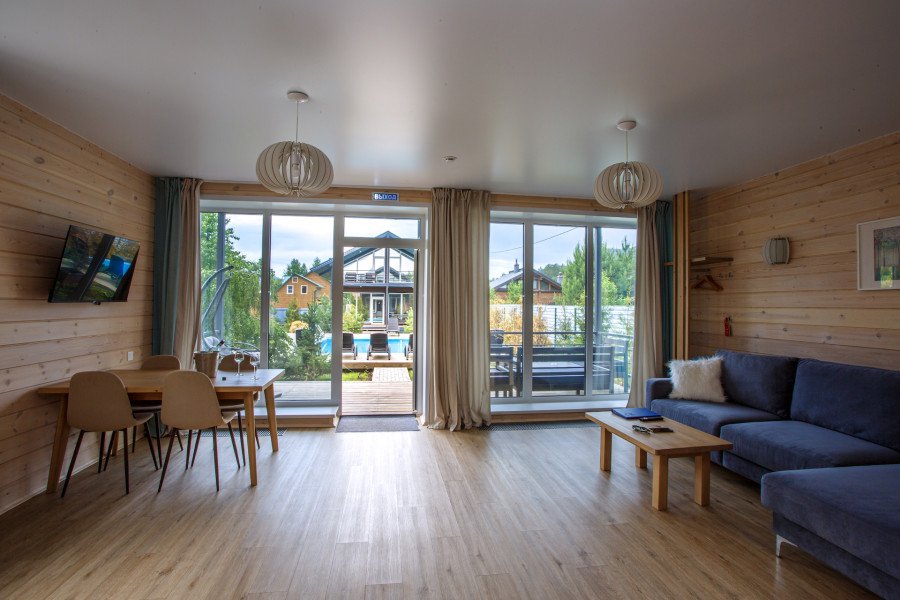 В коттедже есть отдельная спальня, уютный зал с кухонной зоной, холодильник и сейф. Интерьер украшен мебелью ручной работы, а панорамные тонированные окна наполняют пространство светом и ощущением простора.