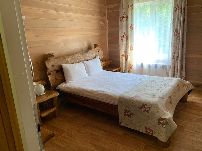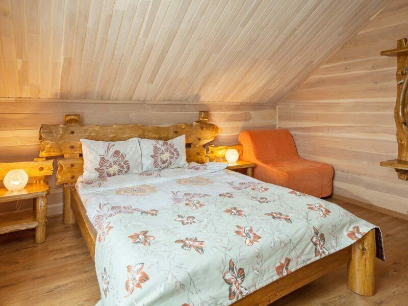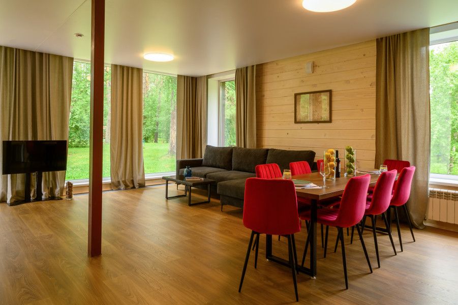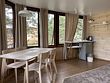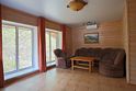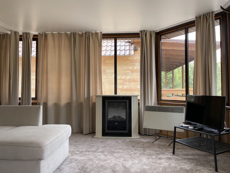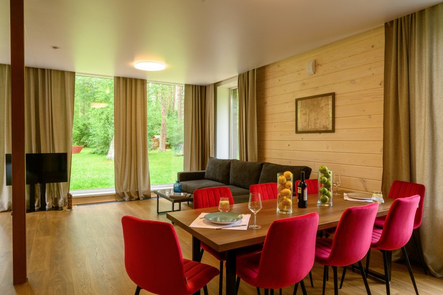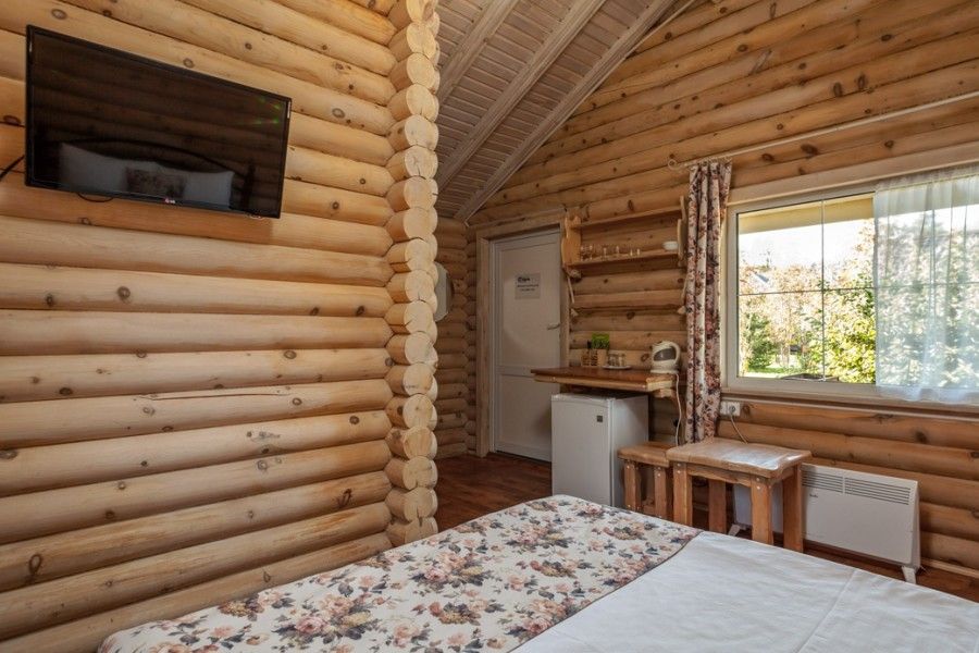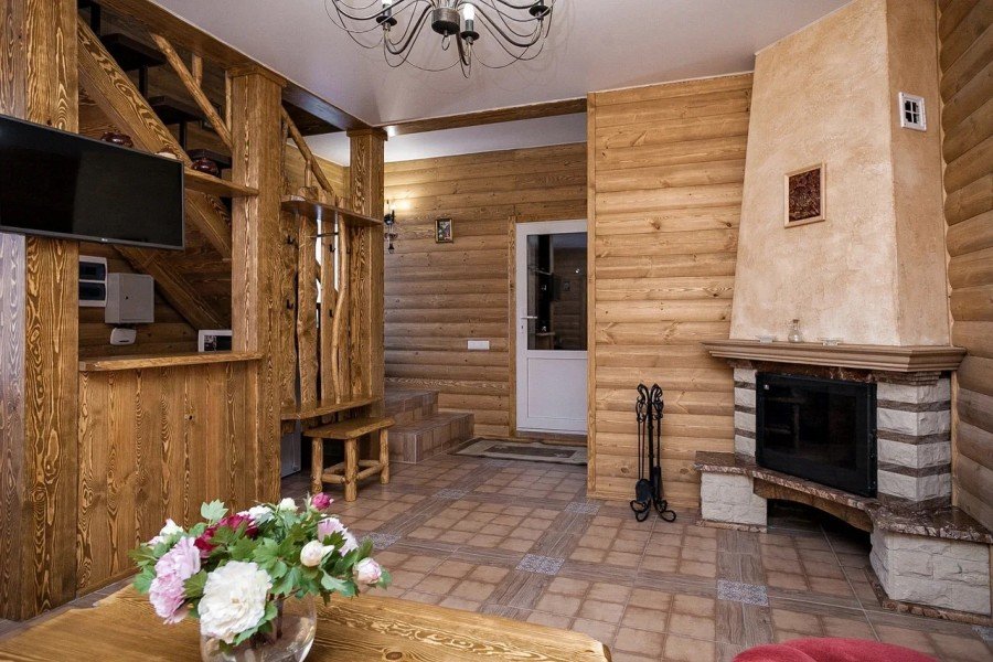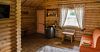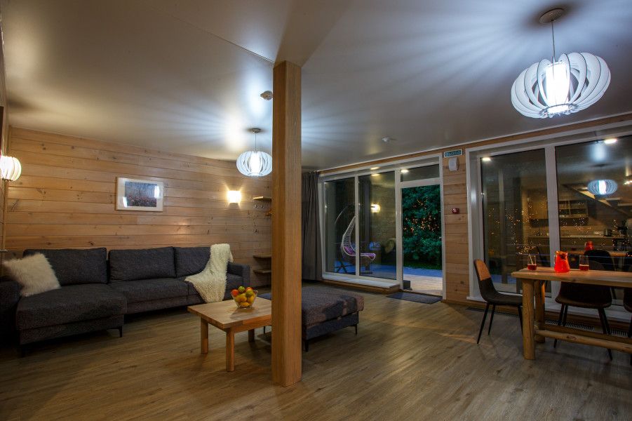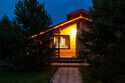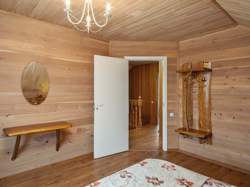 В коттедже есть отдельная спальня, уютный зал с кухонной зоной, холодильник и сейф. Интерьер украшен мебелью ручной работы, а панорамные тонированные окна наполняют пространство светом и ощущением простора.