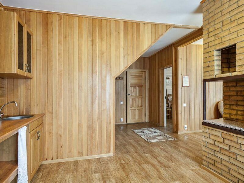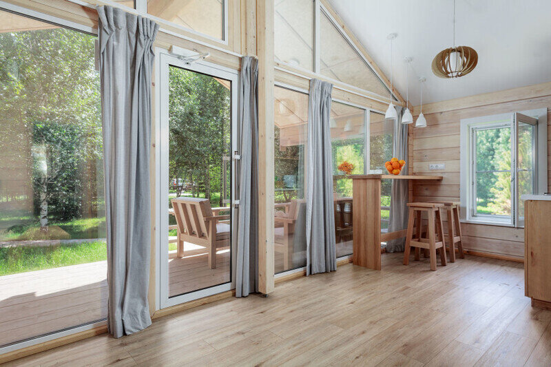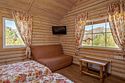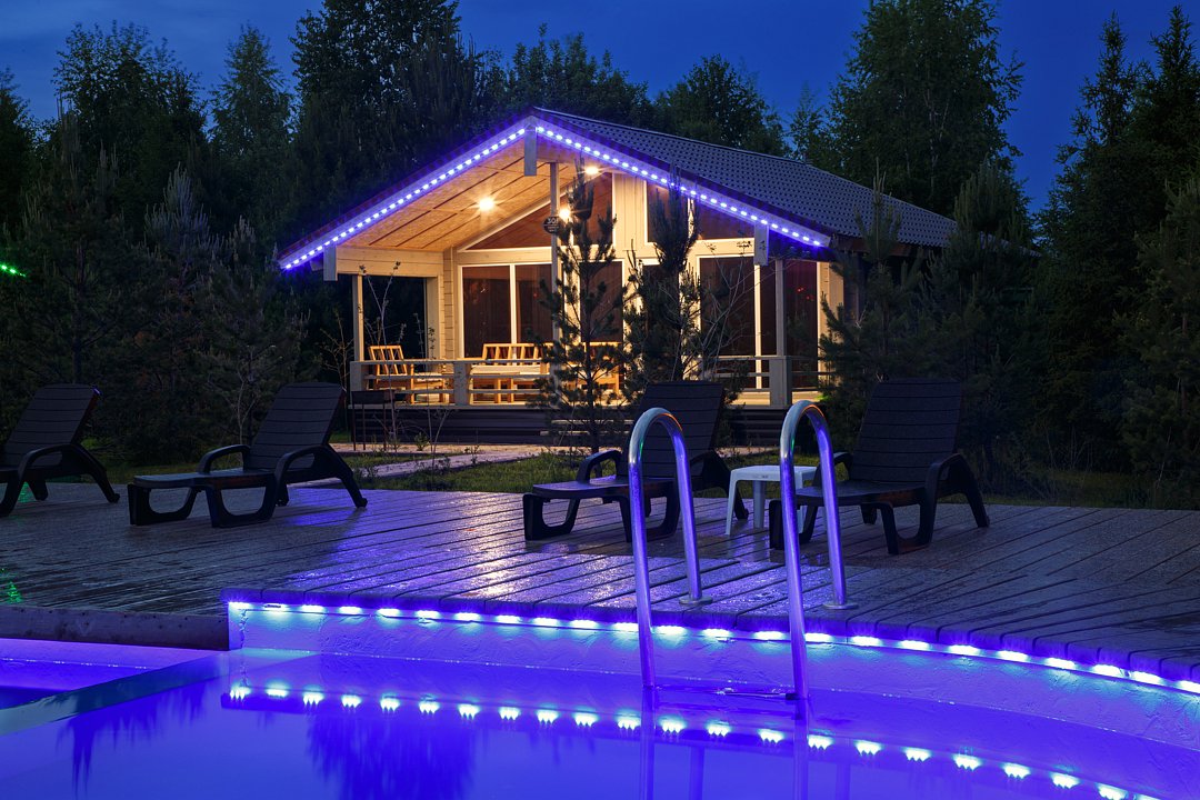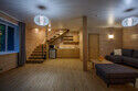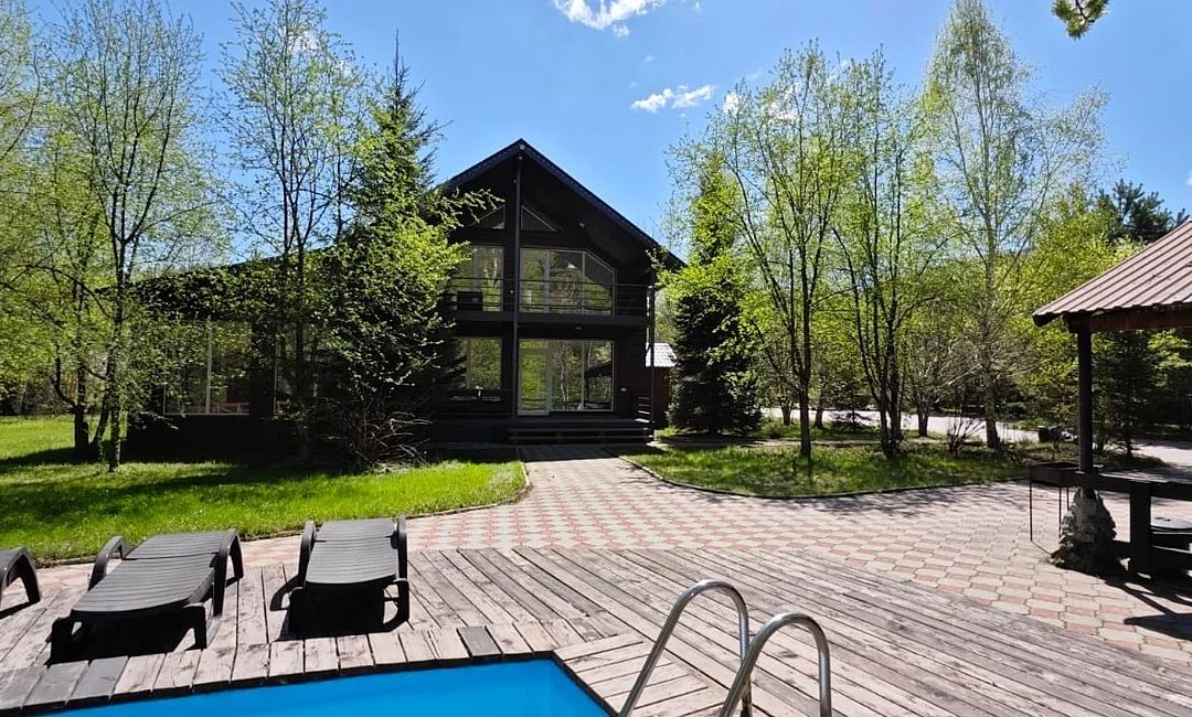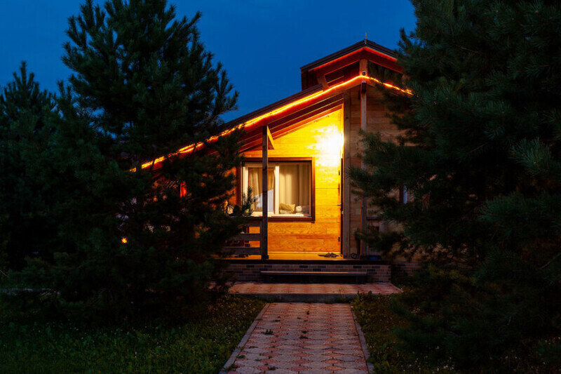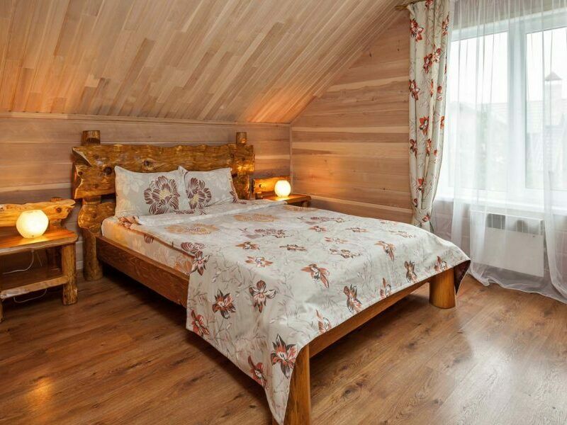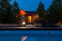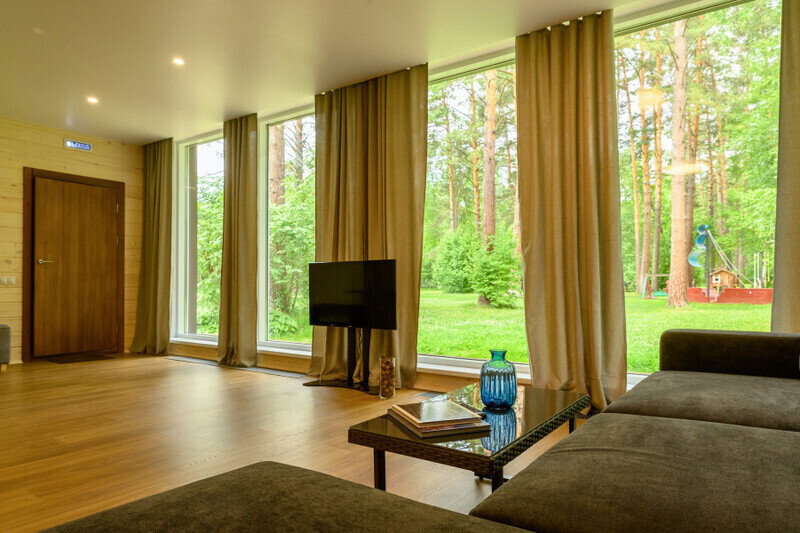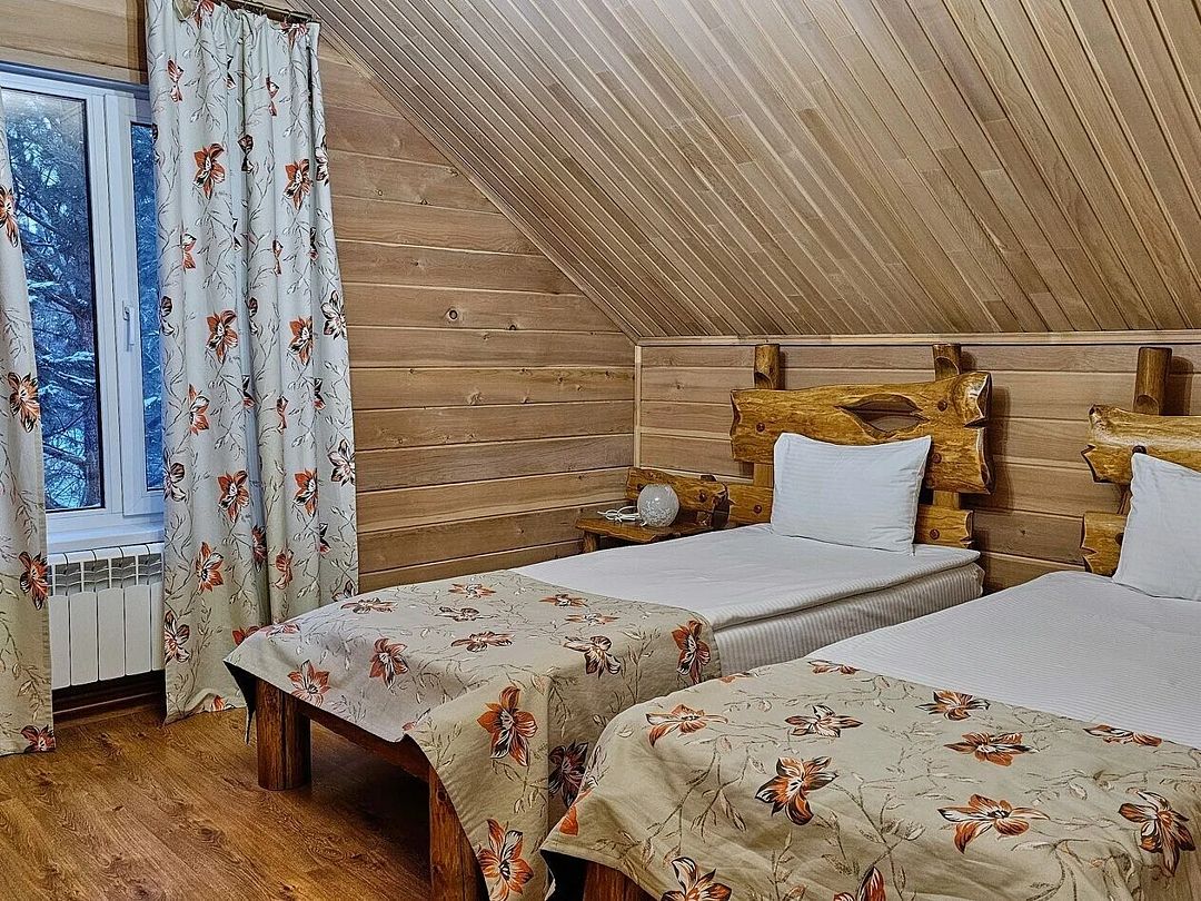В коттедже есть отдельная спальня, уютный зал с кухонной зоной, холодильник и сейф. Интерьер украшен мебелью ручной работы, а панорамные тонированные окна наполняют пространство светом и ощущением простора.