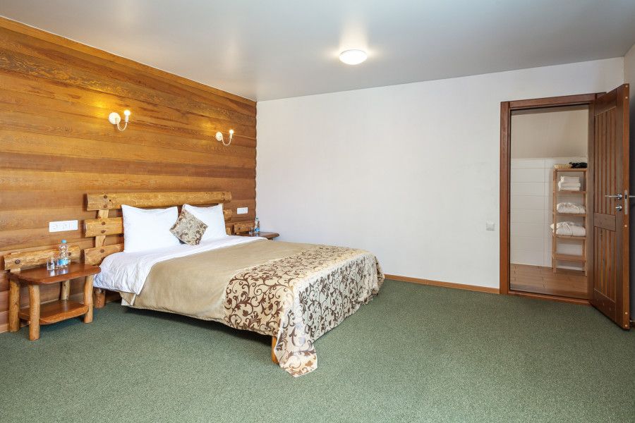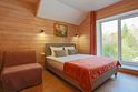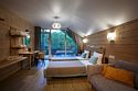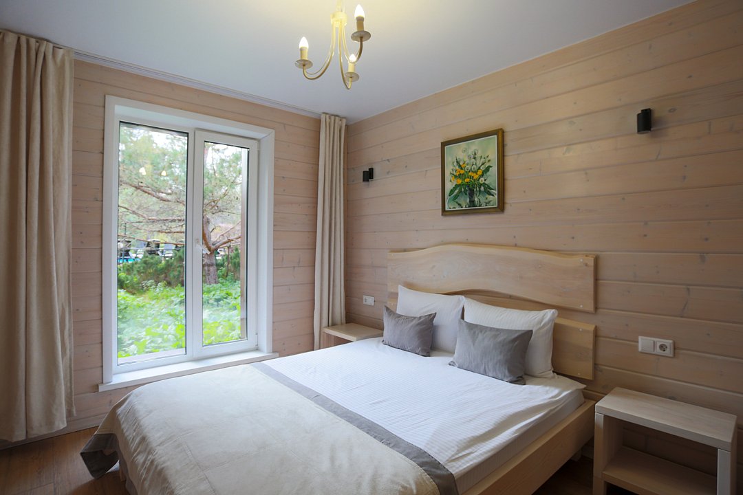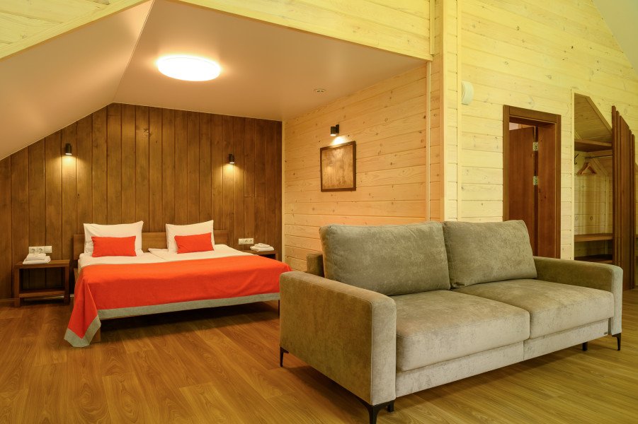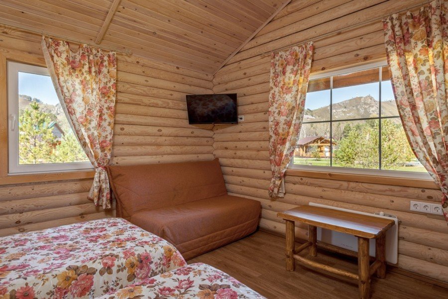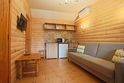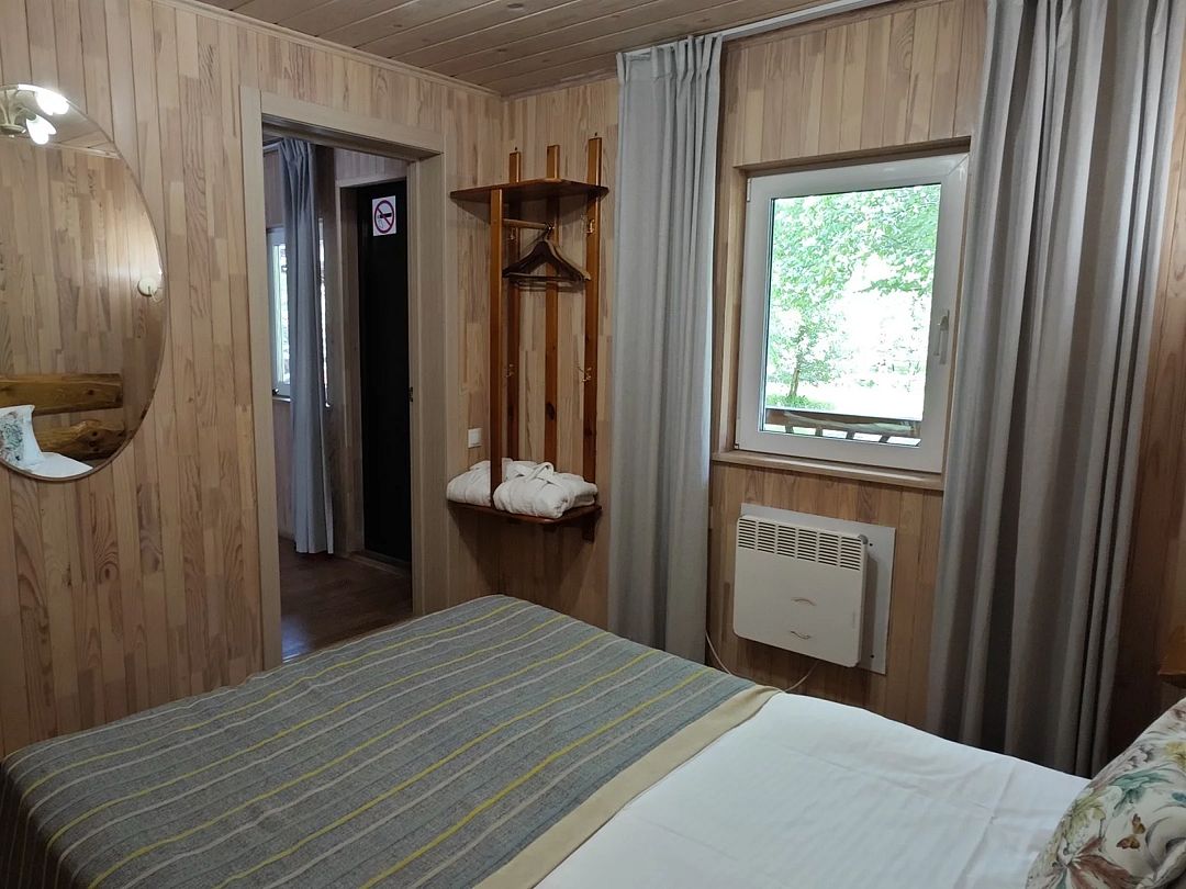 Отдельно стоящий двухкомнатный шале с террасой, камином и собственной беседкой. 2х спальная кровать, раскладной диван, тумбочки с бра, пуфик, вешалка, мини-холодильник, чайник, ЖК телевизор. Ванная комната с душем и индивидуальными принадлежностями, фен.