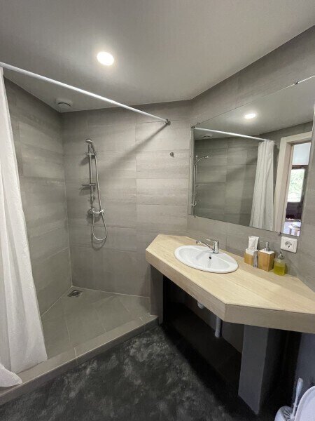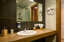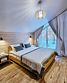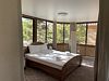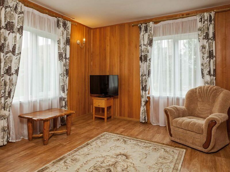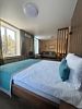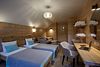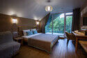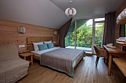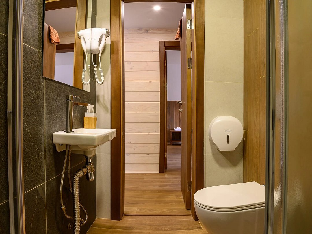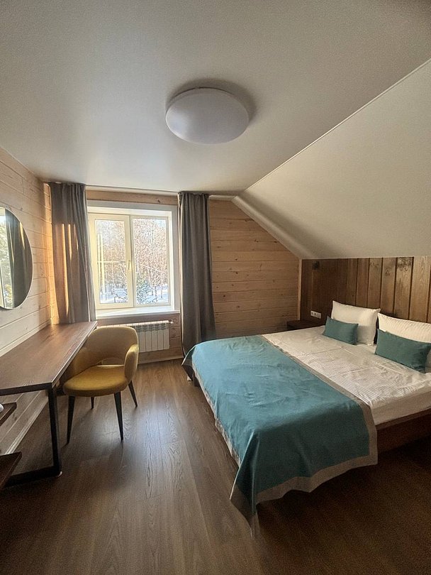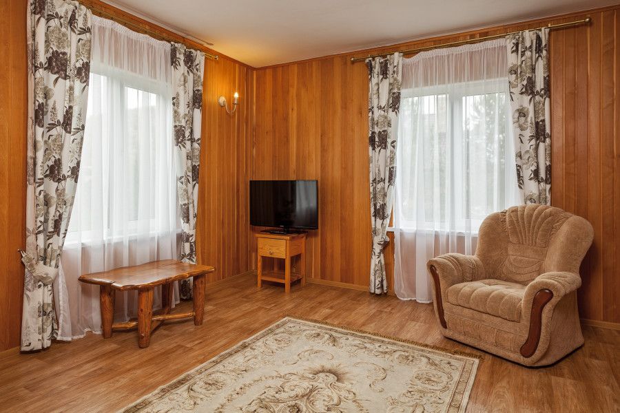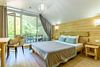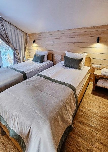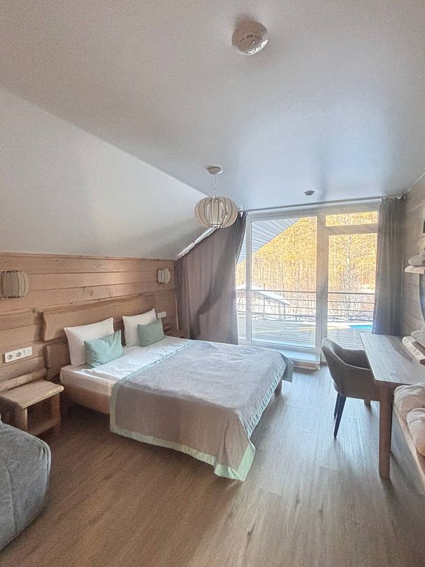 Отдельно стоящий двухкомнатный шале с террасой, камином и собственной беседкой. 2х спальная кровать, раскладной диван, тумбочки с бра, пуфик, вешалка, мини-холодильник, чайник, ЖК телевизор. Ванная комната с душем и индивидуальными принадлежностями, фен.