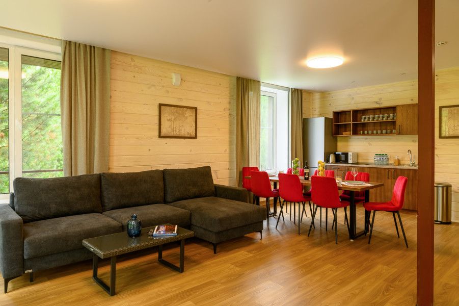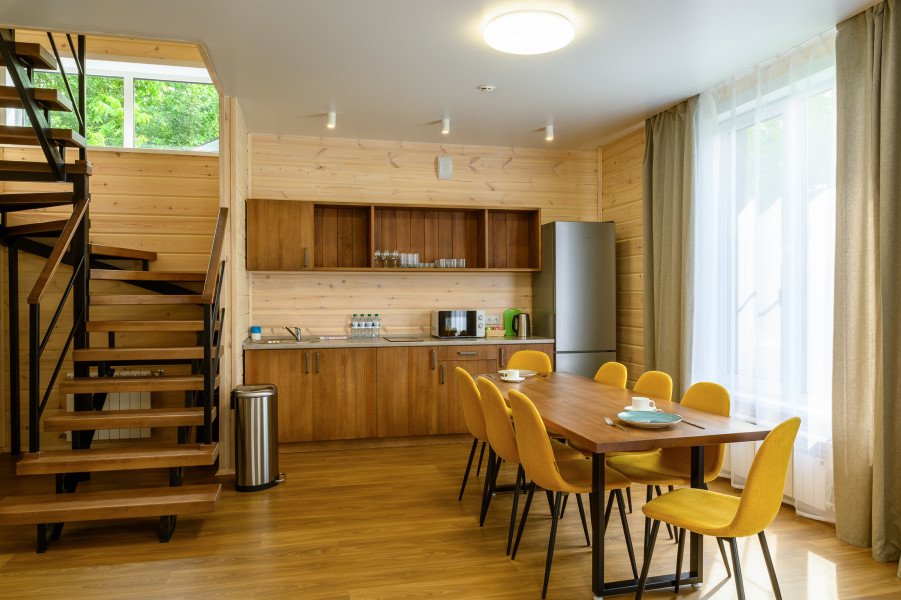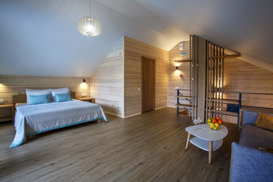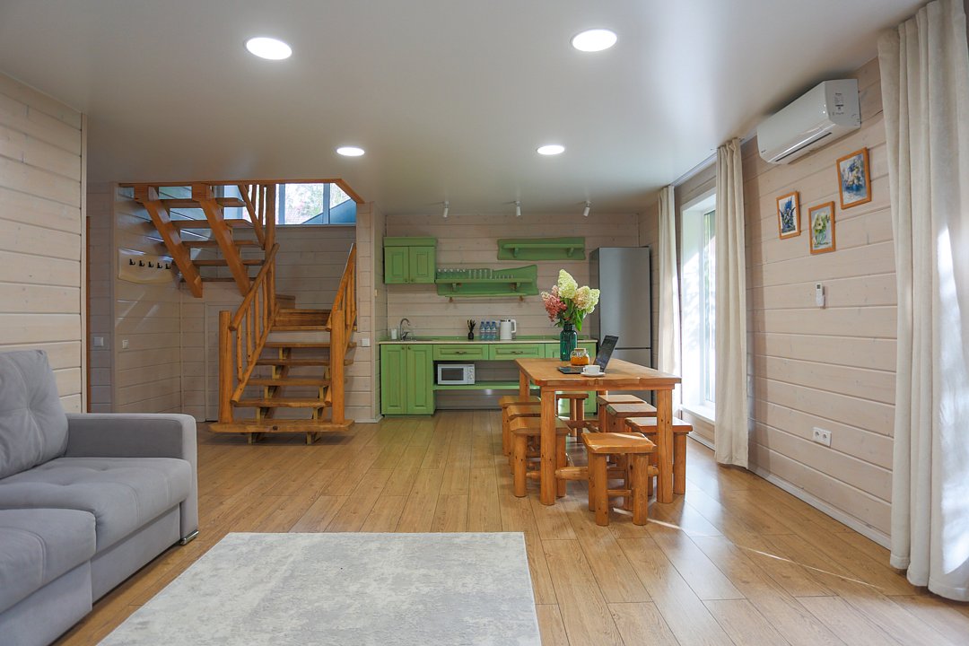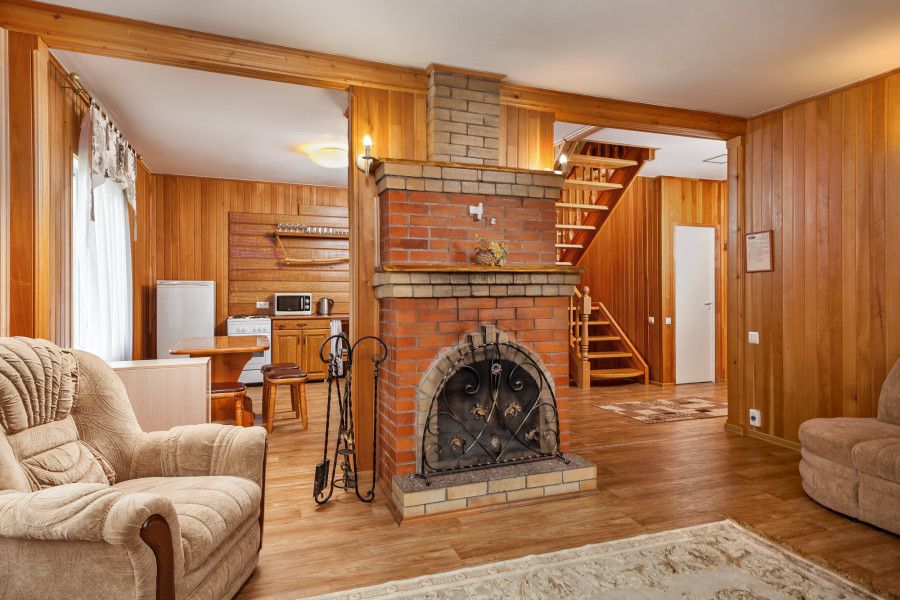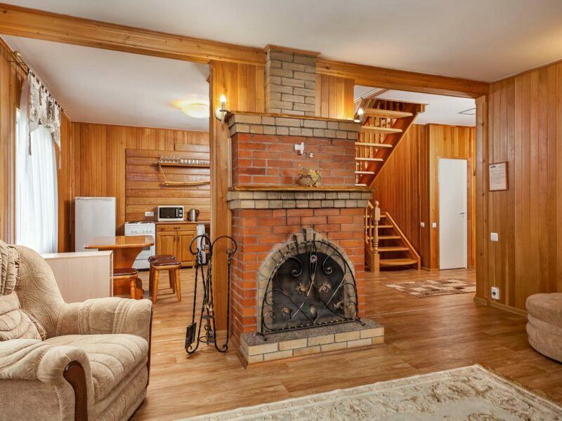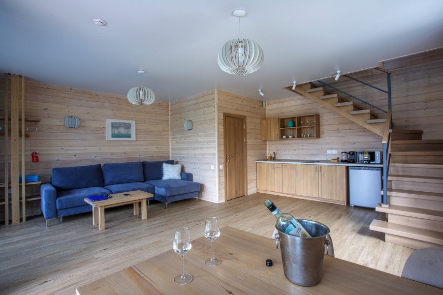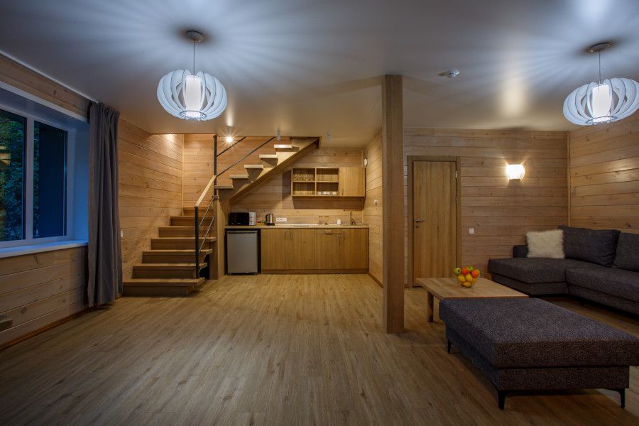 Двухкомнатный номер в трехэтажном коттедже. Общая гостиная зона с камином, уютными диванами, кухонной зоной. Балкон дает возможность наслаждаться местными пейзажами.