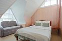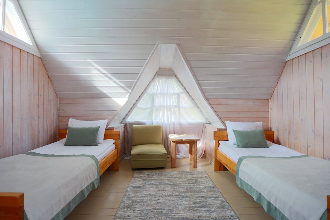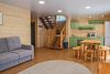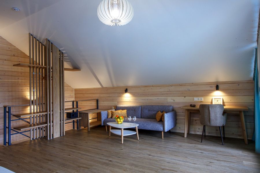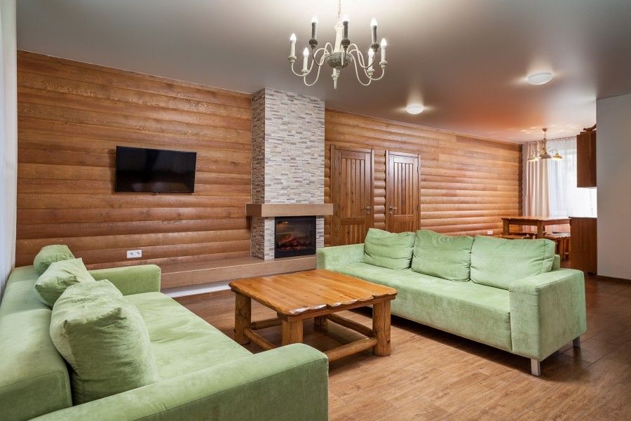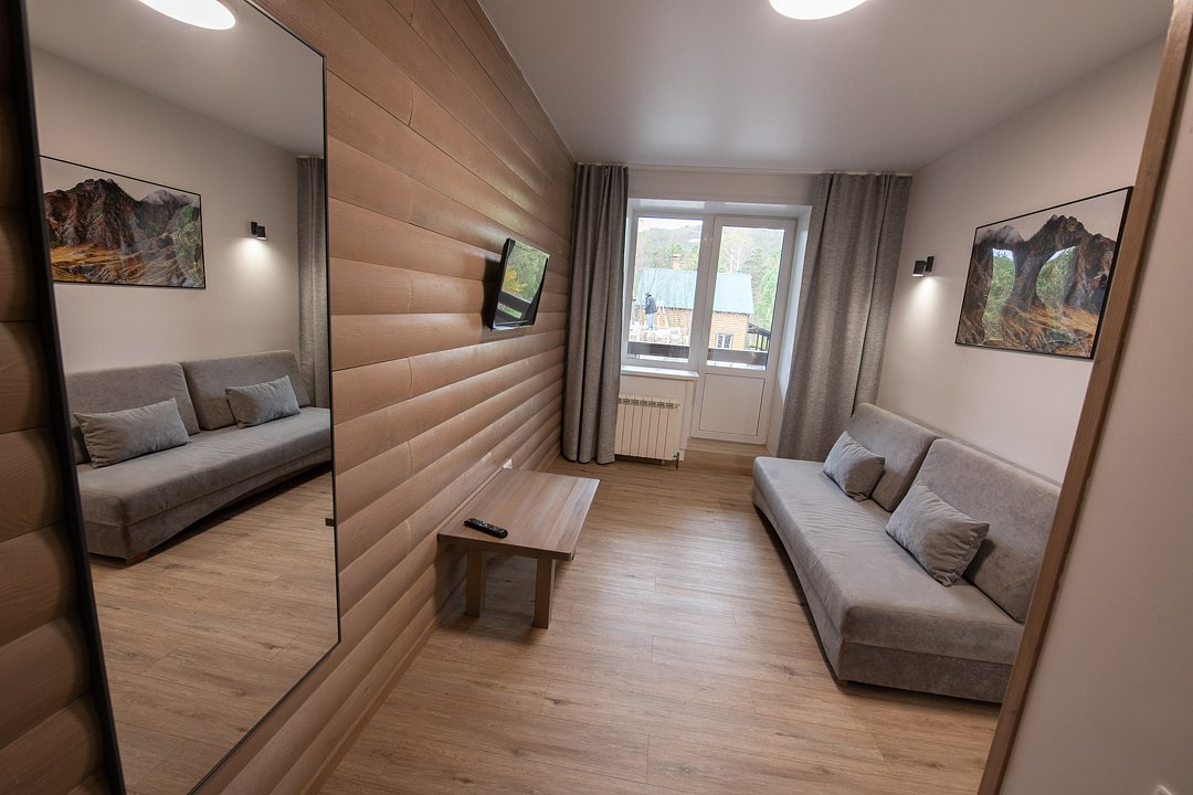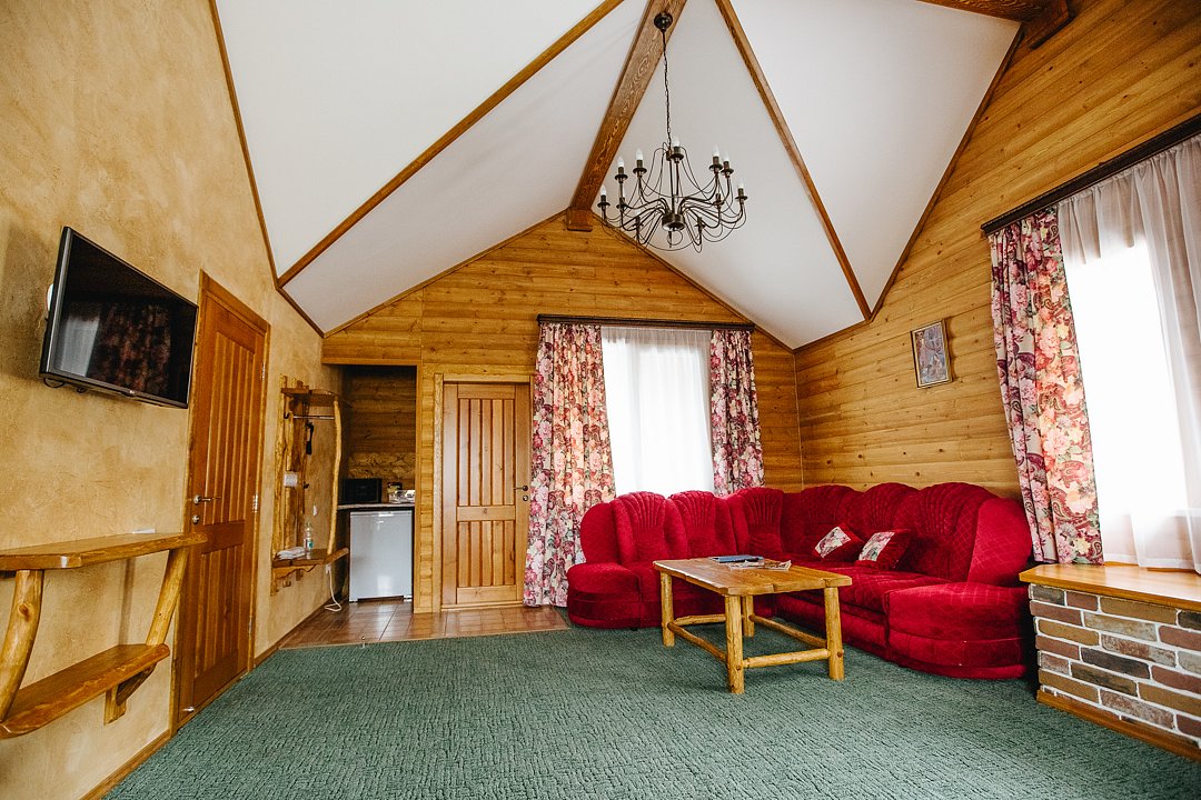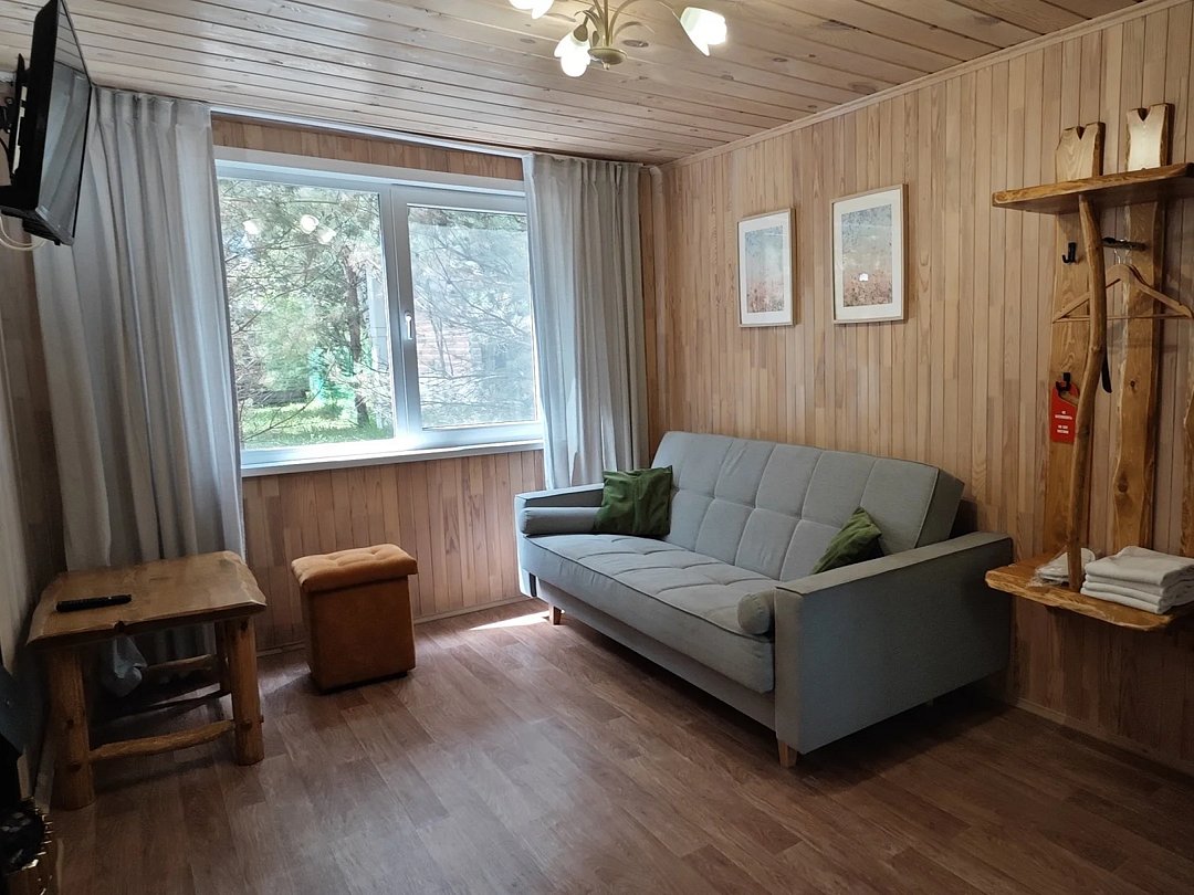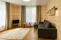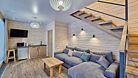 Двухкомнатный номер в трехэтажном коттедже. Общая гостиная зона с камином, уютными диванами, кухонной зоной. Балкон дает возможность наслаждаться местными пейзажами.