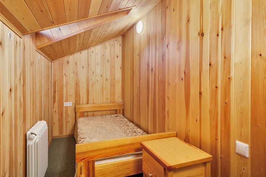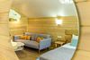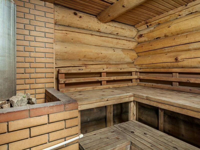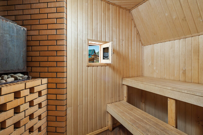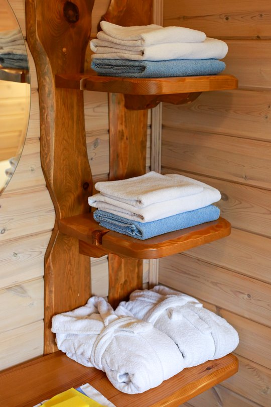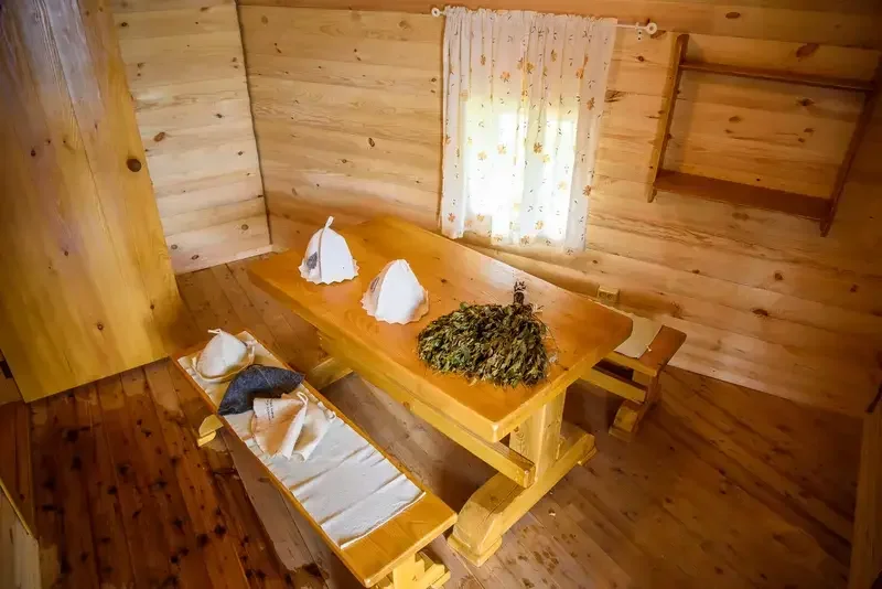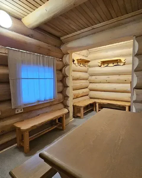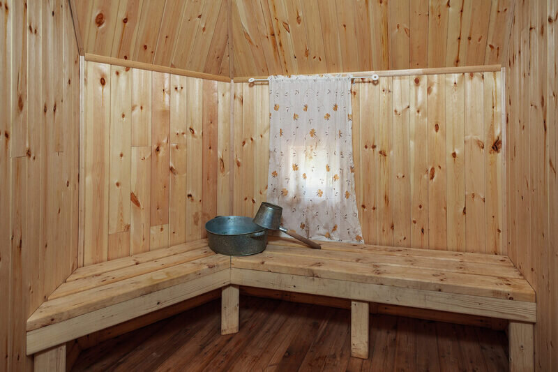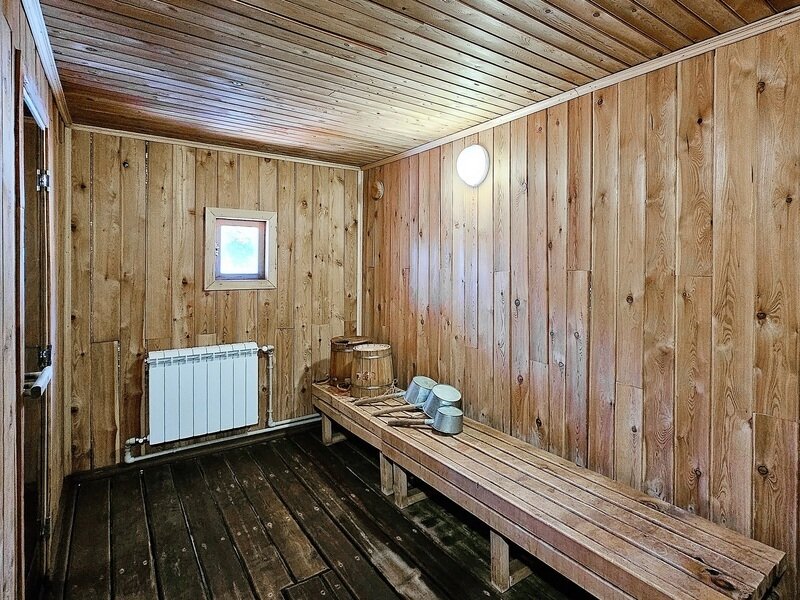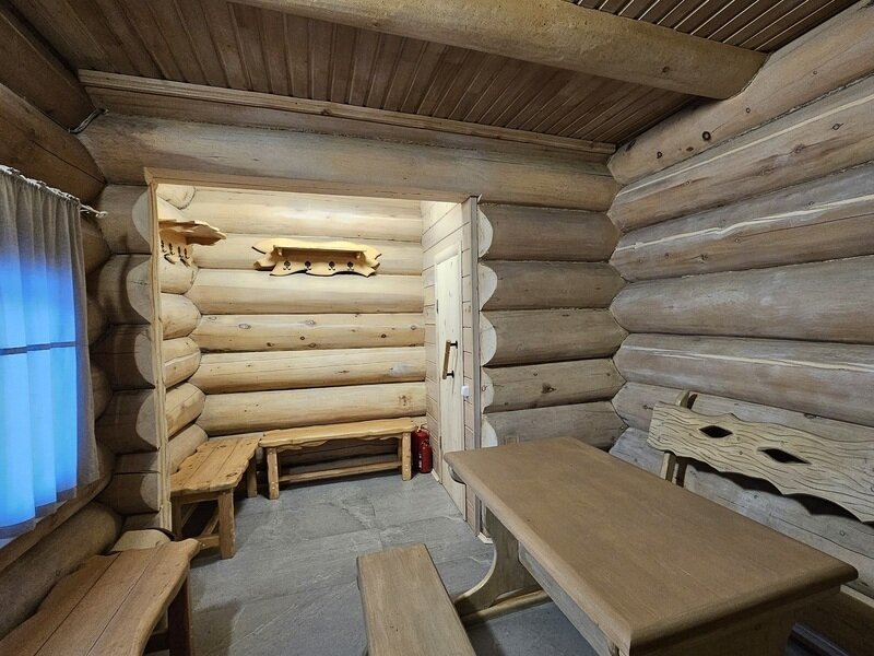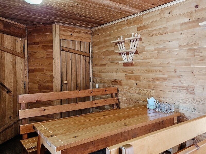 Баня включает в себя парную, зону отдыха и набор банных принадлежностей (полотенце, простыня, тапочки) на каждого гостя. Вместимость до 6 человек.