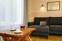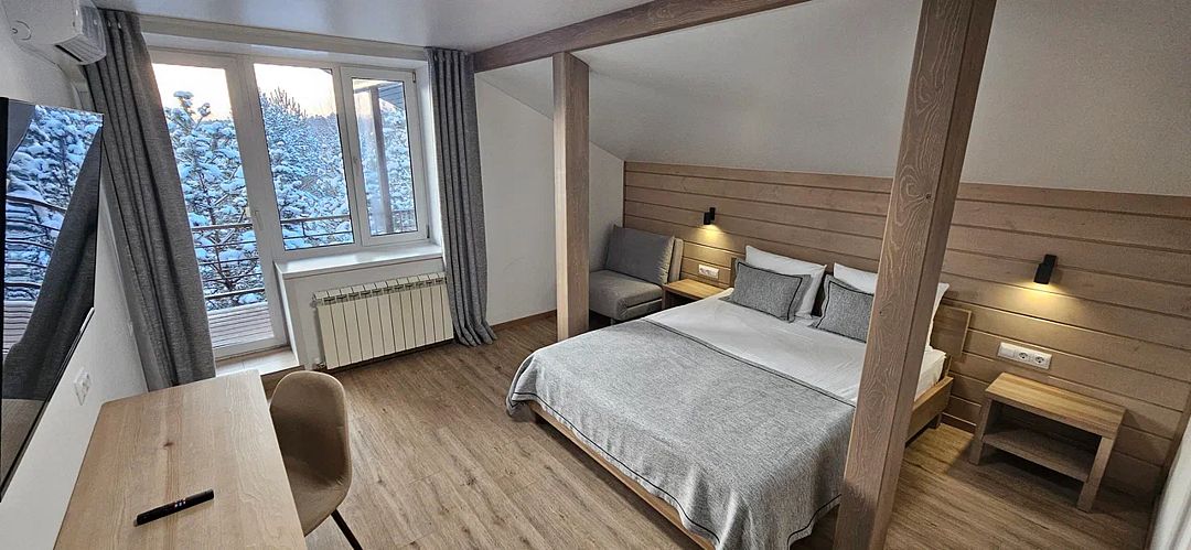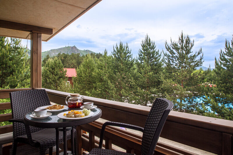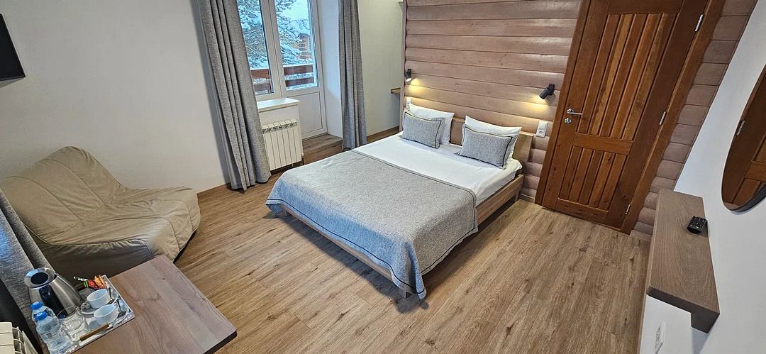 Просторный и уютный номер стандартного класса, с двуспальной или двумя односпальными кроватями. Общая гостиная зона с камином, уютными диванами, кухонной зоной. Балкон дает возможность наслаждаться местными пейзажами.