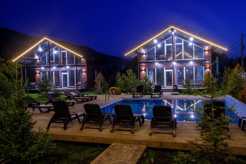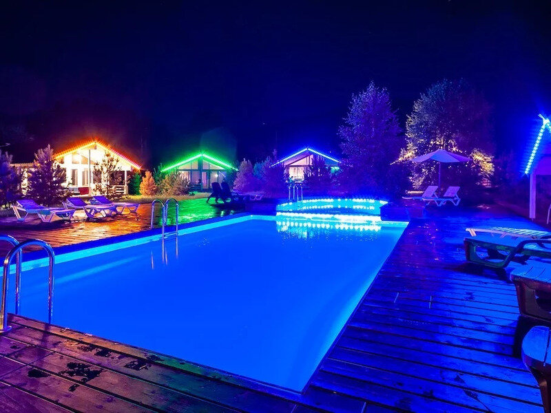 Каждый коттедж оборудован охраняемым парковочным местом, а в каждом номере есть ванная комната и базовый набор удобств. На территории комплекса расположены 9 бассейнов разных размеров и типов, а также банный комплекс и открытые и закрытые беседки.