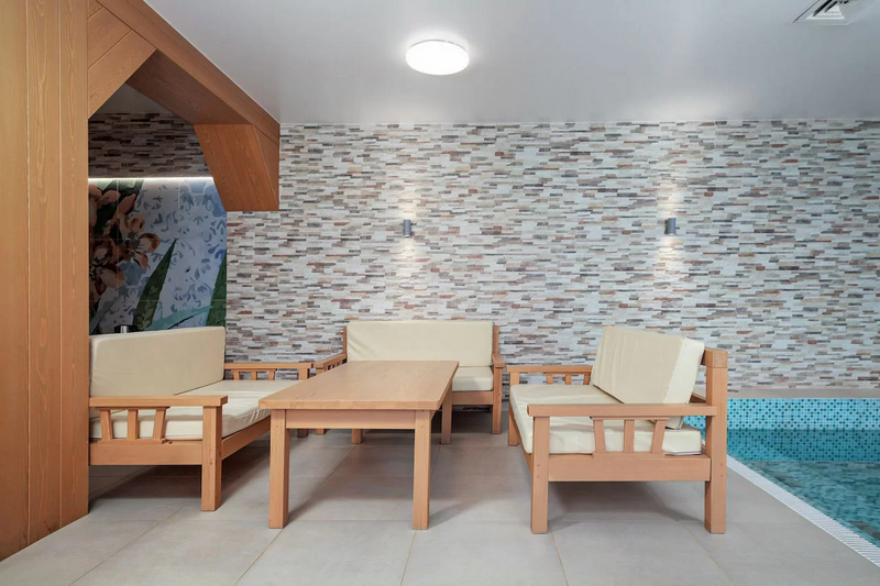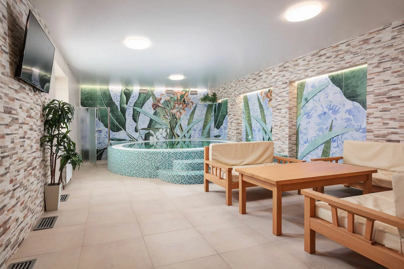 Инфраструктура: бассейн, тапочки, полотенца, простыниТемпература парения: 40 °CВремя работы: до 23 чХаммам с джакузи