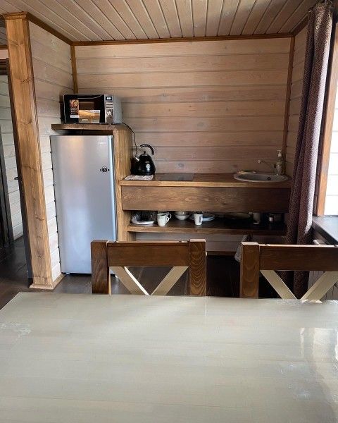 Для отдыха семейной пары доступна комфортная студия, а для компании друзей — коттедж с двумя спальнями. Современные и просторные номера обустроены комфортабельной мебелью, включающей большую кровать, диван, телевизор и фен.