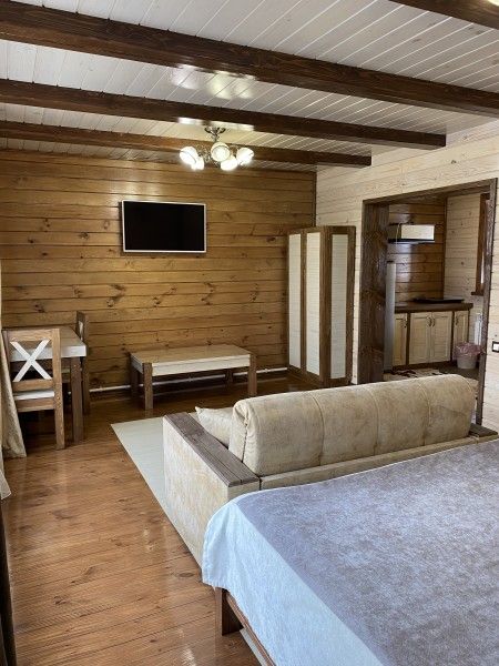 В номере обустроенная кухонная зона, со всей необходимой посудой и техникой. Двуспальная кровать, диван, телевизор. У номера отдельный вход с улицы и терраса с видом на бассейн.