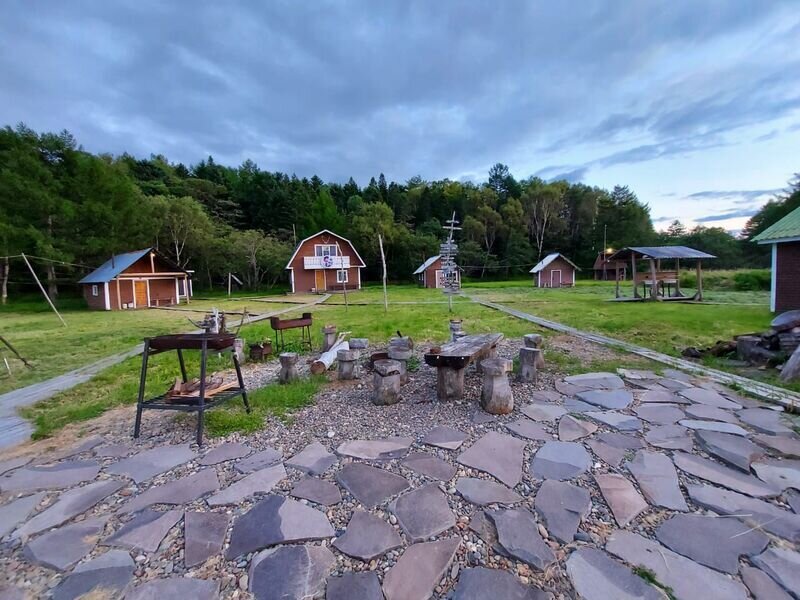 Размещение происходит в деревянных электрифицированных домиках с печным отоплением, которые соединяются между собой деревянными дорожками. На территории имеется столовая и баня. Гостям выдаются банные полотенца и постельное бельё.