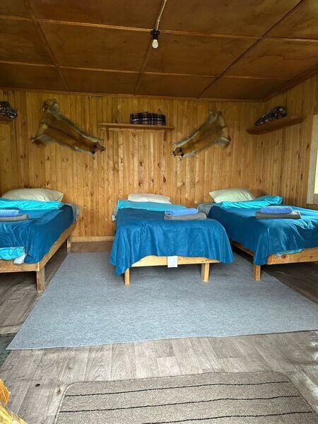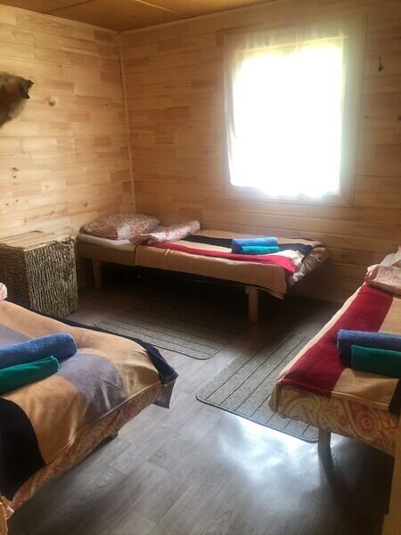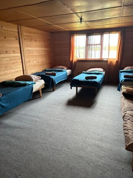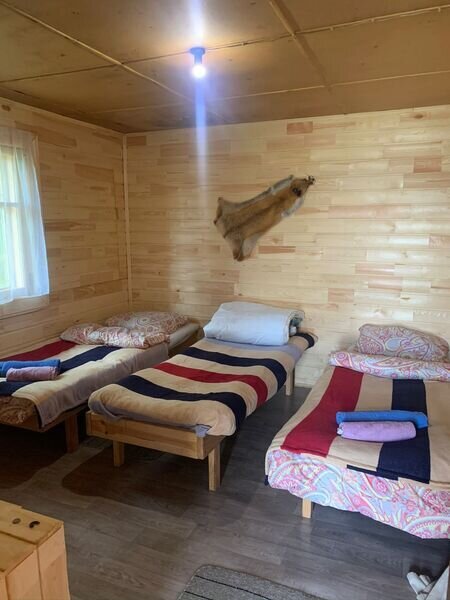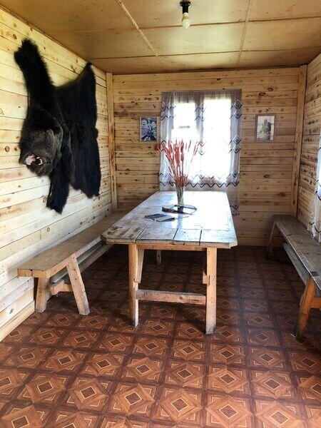 Деревянные домики с печным отоплением, просторная столовая, баня, электричество подается от станции, постройки соединены деревянным тротуаром, предоставляется постельное белье, банные полотенца.