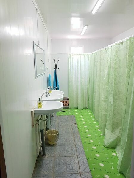 Душ, туалет, горячая вода, холодильник, микроволновка, чайник, телевизор на этаже.