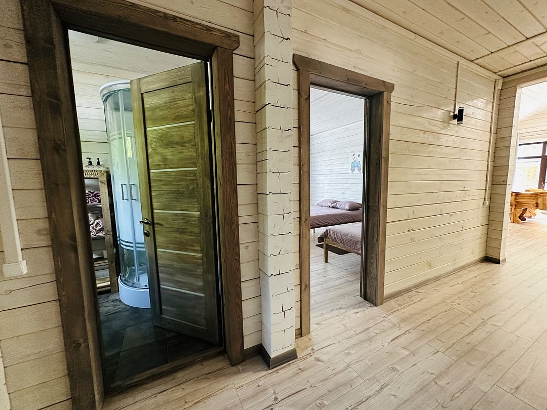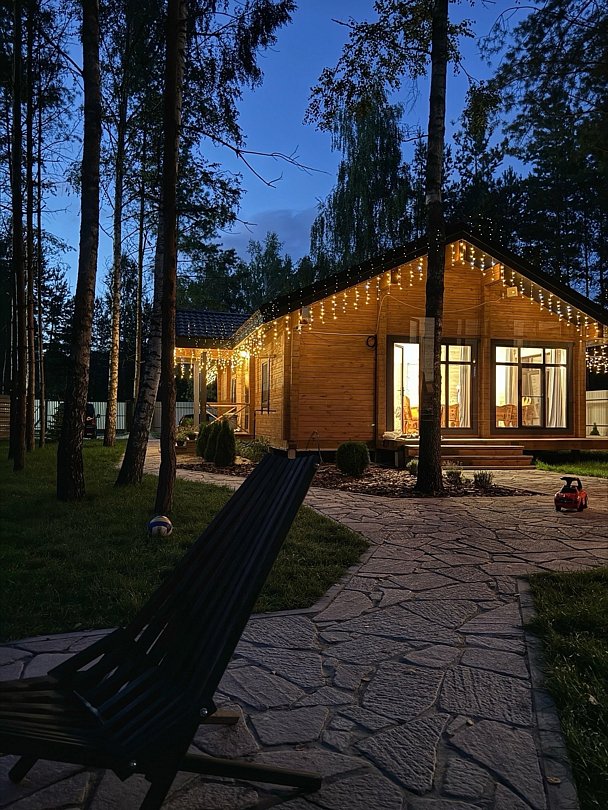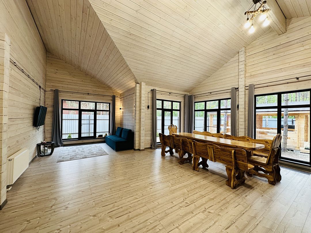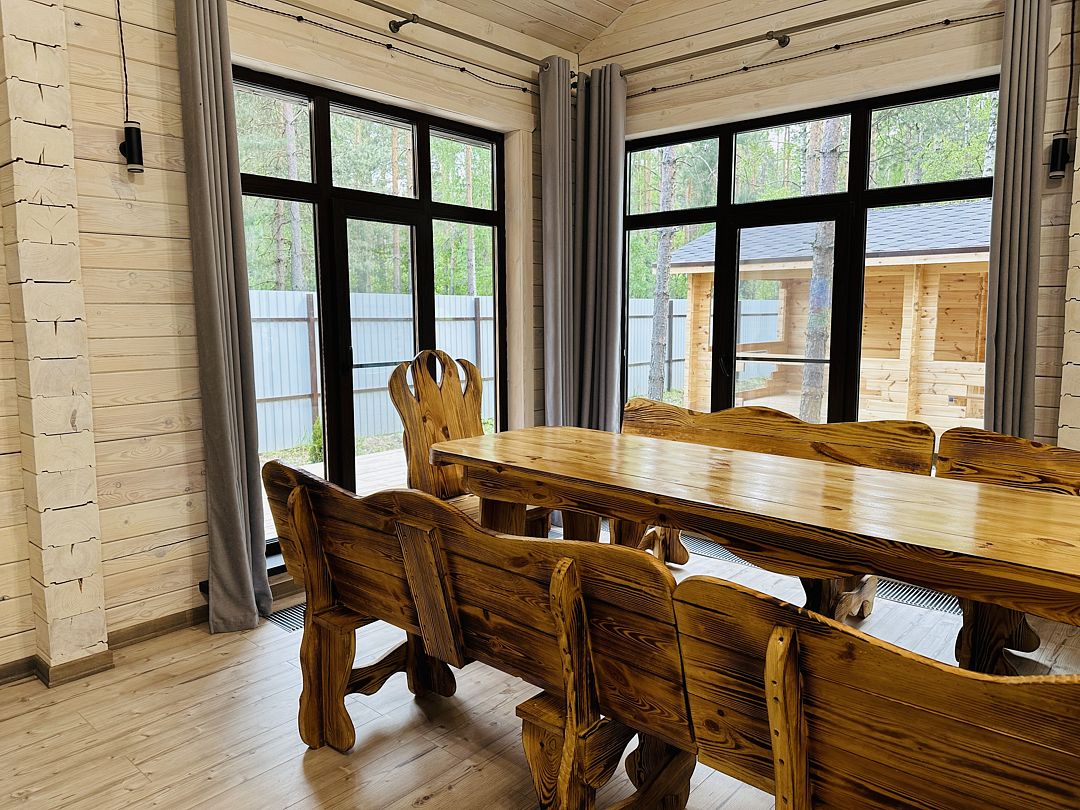 В аренду доступен просторный и уютный дом в живописном уголке леса, идеальное место для тех, кто ищет уединение или планирует семейную встречу с друзьями. Построенный из натурального дерева, этот дом очаровывает своим теплым и уютным обликом.