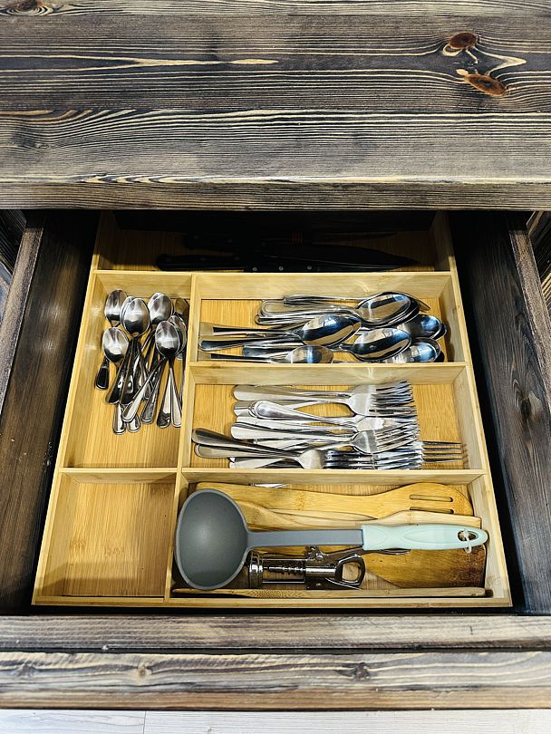 Здесь же вы найдете большой обеденный стол (3 метра) ручной работы из массива дерева, где с легкостью разместится большая компания.