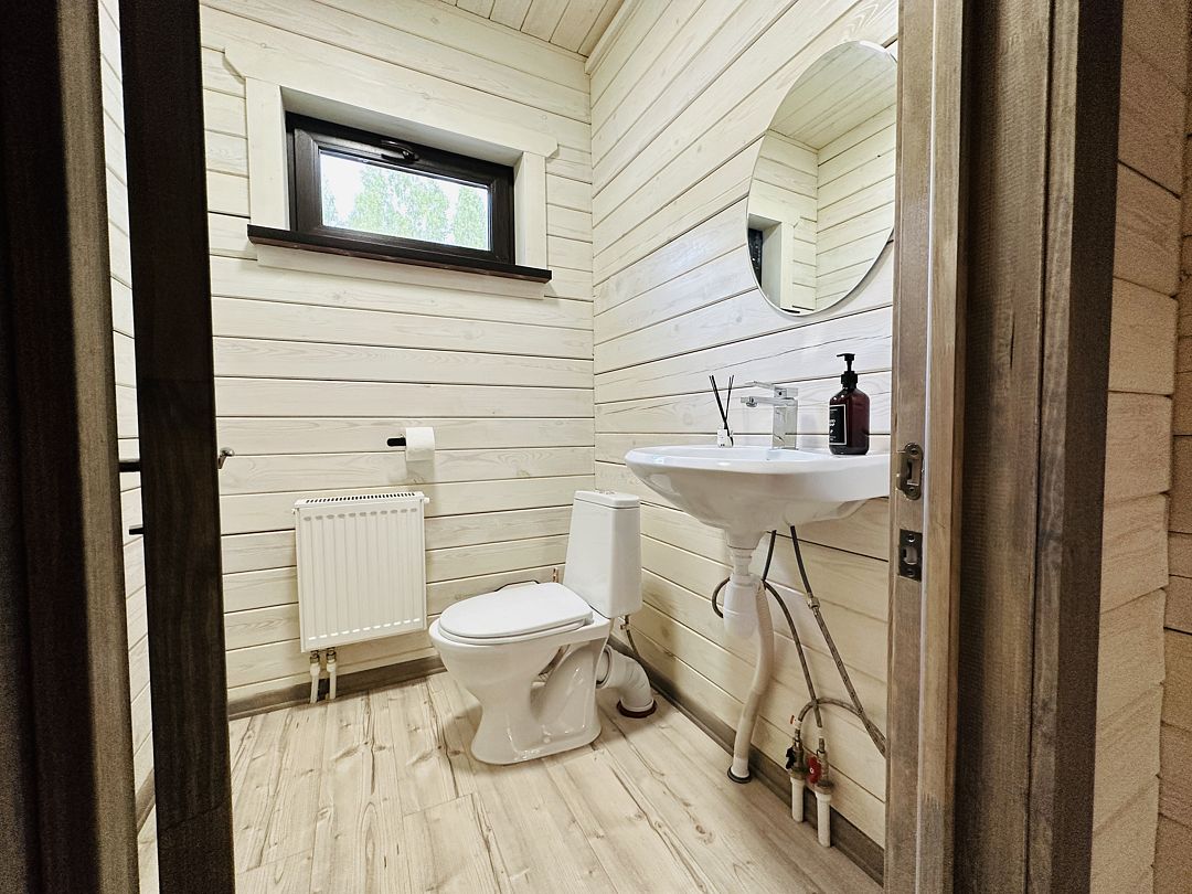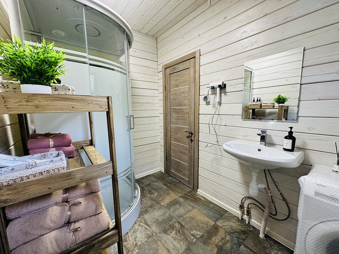 В доме также имеется 2 санузла с душем и феном. На улице большая беседка для отдыха на свежем воздухе, банный чан и мангальная зона для барбекю.
