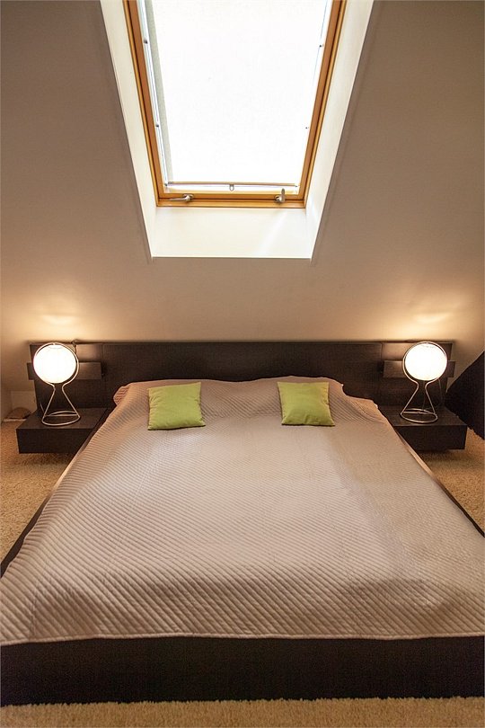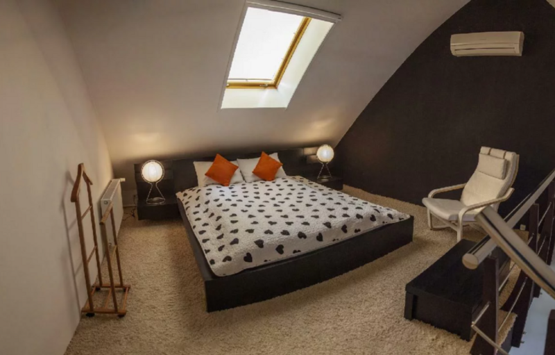На верхнем этаже - спальная зона с двуспальной кроватью, кондиционер.