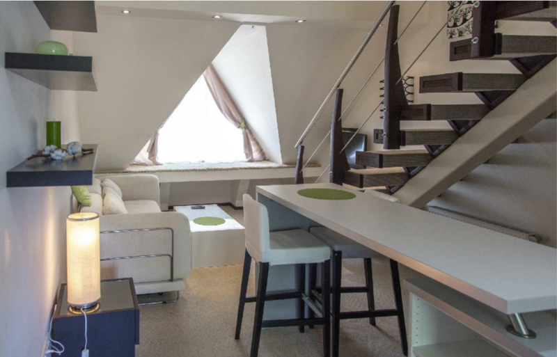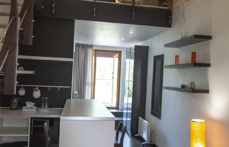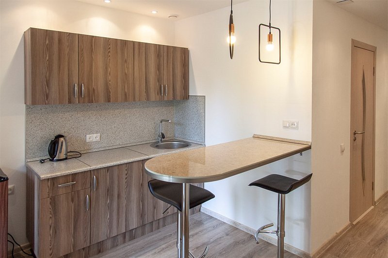 На нижнем этаже номера располагается прихожая, ванная комната, мини-кухня (посуда, стекло, приборы на 4 персоны), чайник, чайный набор, микроволновка, гостиная с диваном, телевизор.