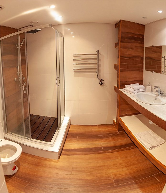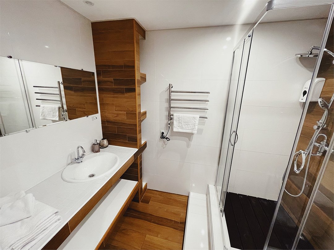 Для постояльцев апарт-отеля закреплено общественное время посещения бань: ежедневно с 9:00 до 11:00. Необходим купальный костюм. Услуга платная — 1200 ₽ с человека.