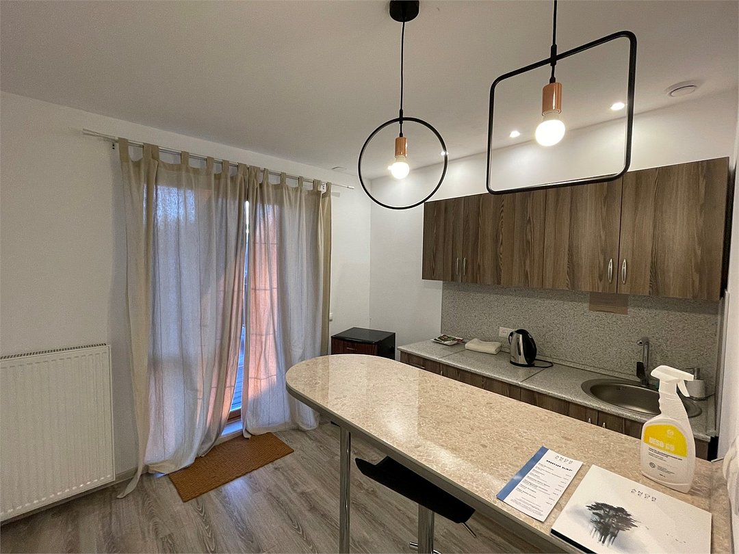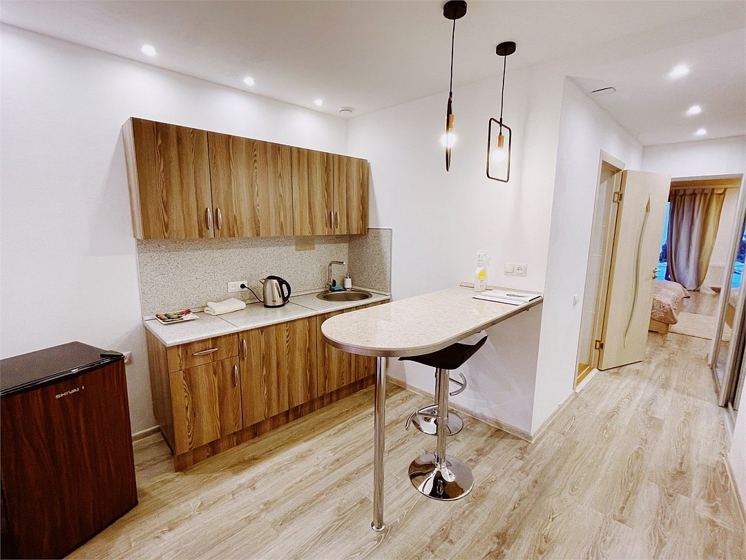 В номере: ванная комната с душем, мини-кухня (посуда, приборы на 3 персоны), холодильник, чайник, микроволновка, телевизор, кондиционер, чайный набор.