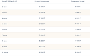 - аренда ресторана (с 12:00 до 23:00) — 50000 ₽ (пн–чт), 60000 ₽ (пт–вс);