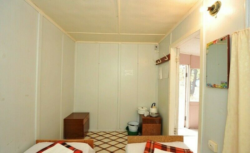 2 тумбочки, элктроплитка, холодильник, посуда, удобства на территории: душ, стационарный туалет, биокабинки.