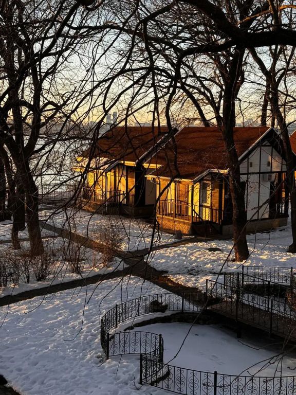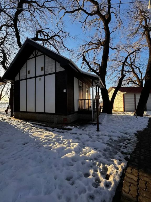 В домике двухместная кровать и кресло-кровать расположен в спальне. В домике: двухместная кровать + кресло-кровать, ТВ, холодильник, чайник, микроволновка, набор посуды, душ, туалет, постельное белье, кондиционер, кухня (без плиты), мангальная зона недалеко домика. Домик хорошо отапливается.