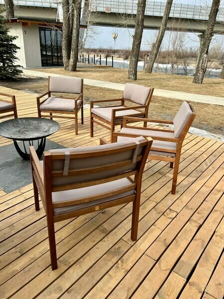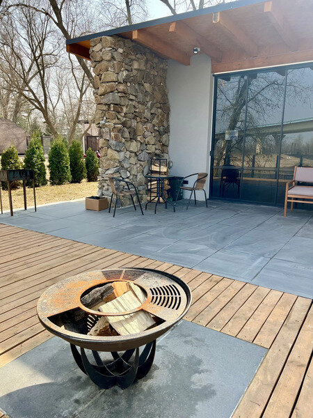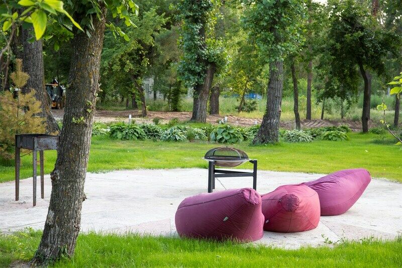 Уличная терраса: очаг (может быть использован декоративно, либо для приготовления пищи), мангал (классика, высокие ножки), кресла для отдыха. Стоимость: пятница–воскресенье — 2500 ₽/час (с 09:00 до 13:00), 3000 ₽/час