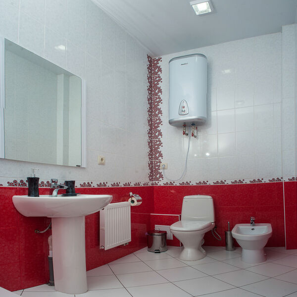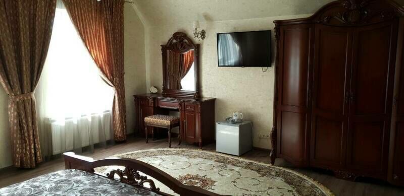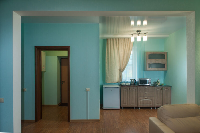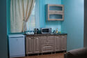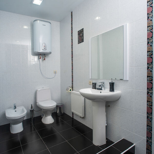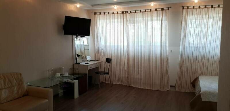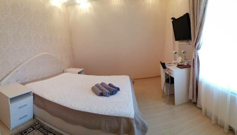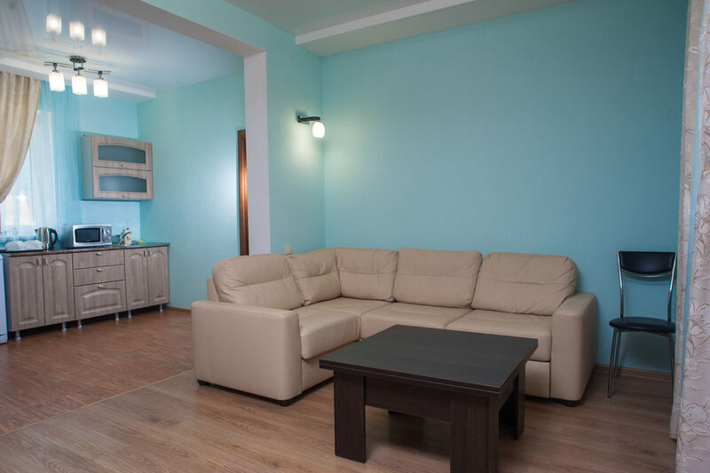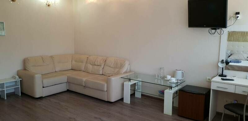 В номере: двуспальная кровать, прикроватные тумбочки, мягкая раскладная мебель, журнальный стол, шкаф-купе, телевизор, СПЛИТ-СИСТЕМА, мини-бар, чайник, посуда на две персоны. Туалетная комната: душ, раковина, биде, унитаз, зеркало, фен, разовые предметы личной гигиены.