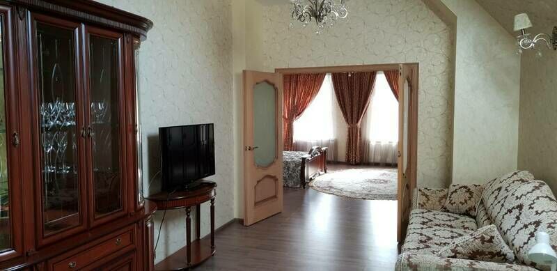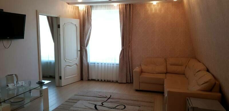 Гостиная: мягкая раскладная мебель, 2 кресла, журнальный стол, шкаф-сервант, телевизор, чайник, набор посуды на две персоны. Спальная комната: двуспальная кровать, прикроватные тумбочки, туалетный столик, платяной шкаф, шкаф-купе, телевизор, СПЛИТ-СИСТЕМА, мини-бар. Туалетная комната: душевая, раковина, унитаз, биде, джакузи, зеркало, фен, разовые предметы личной гигиены, халат, тапочки.