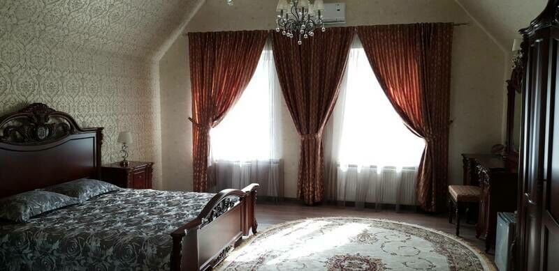 Одноэтажный трехкомнатный дом с двумя санузлами и гостиной. В доме две спальные комнаты с двуспальными кроватями, платяным шкафом, комодом, прикроватными тумбочками, телевизором, СПЛИТ-СИСТЕМОЙ. Гостиная комната: прихожая, холл, кухонная зона. Оборудование: раскладной диван, телевизор, стол-трансформер, холодильник, микроволновая печь, чайник, посуда, приборы на 6 человек. Туалетная комната: душ, раковина, зеркало, унитаз, биде, разовые предметы личной гигиены, фен.
