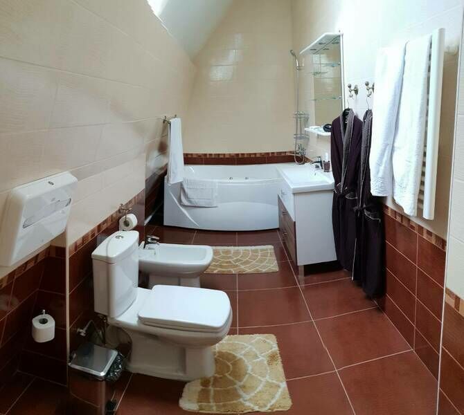 Все удобства: туалет, душ, холодильник, СПЛИТ-СИСТЕМА, платяной шкаф-купе, чайник, телевизор, двуспальная кровать, стол, микроволновая печь, эл. чайник, 4 бокала, 4 стула - расположены на первом этаже.