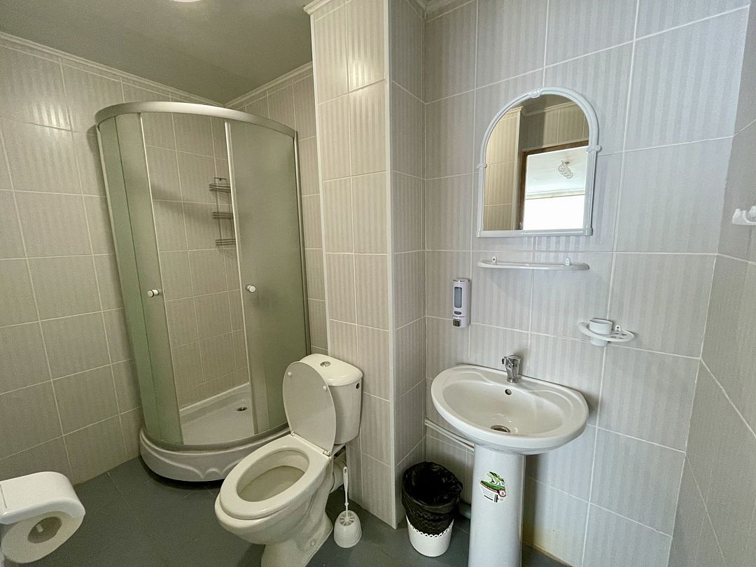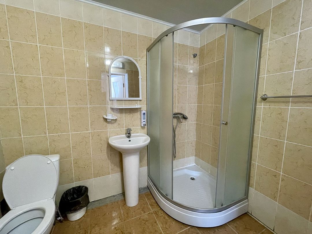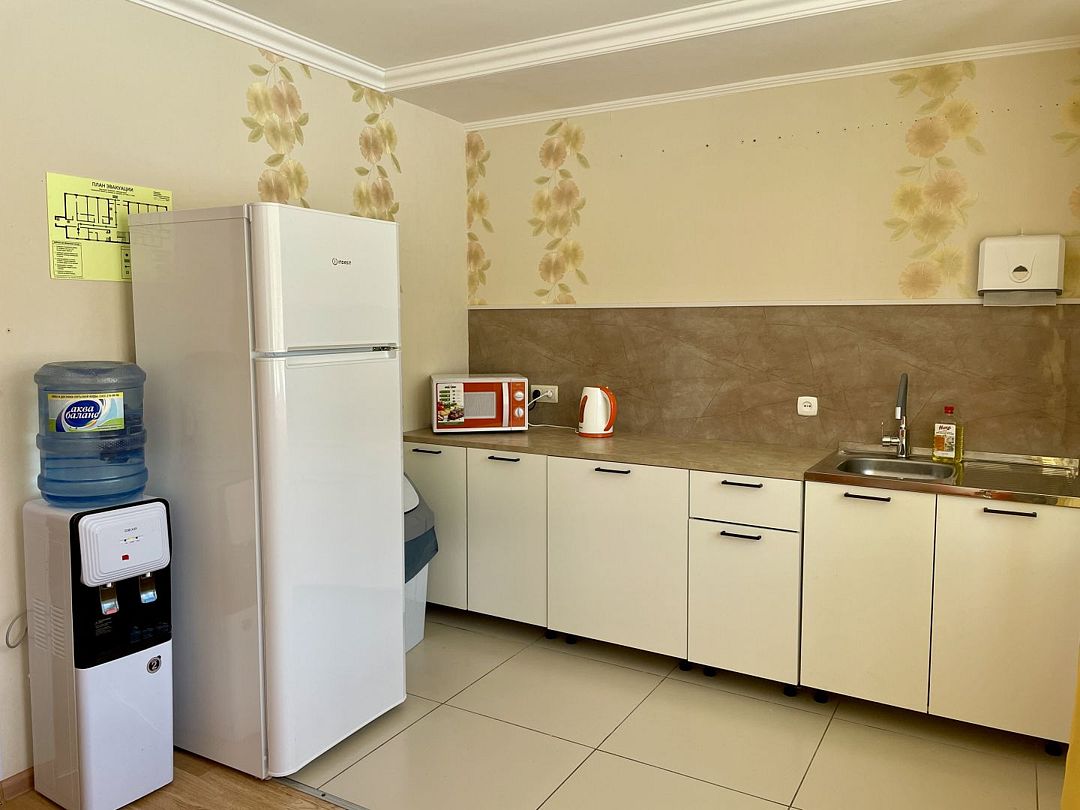 Удобства и душевая кабина в номере. На этаже есть общая обеденная и кухонная зона с чайником, микроволновой печью, холодильником и кулером. В общем холле расположена библиотека и телевизор.