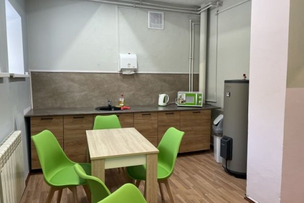 В корпусе есть общая обеденная и кухонная зона с чайником, микроволновой печью, холодильником и кулером. В общем холле расположена библиотека и телевизор.