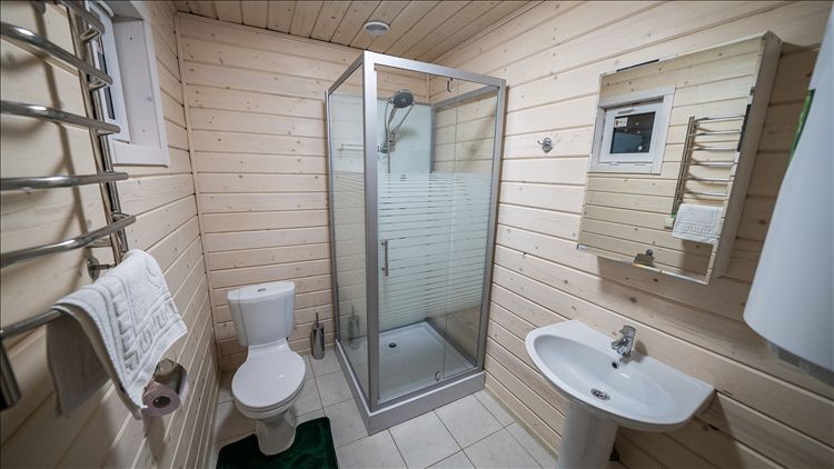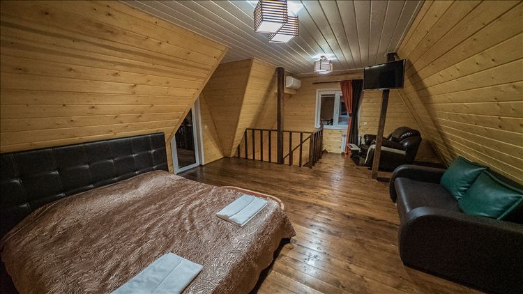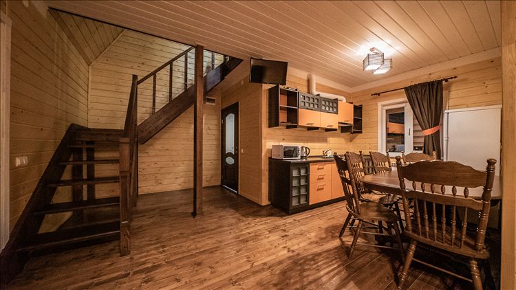 4 двухэтажных коттеджа-сруба. 1 этаж: просторный холл с кожаным диваном (2 взрослых места), кухня (большой холодильник, эл.плита, микроволновая печь, комплект посуды на 8 персон), ванная комната. 2 этаж: две спальни с двуспальными кроватями (в одной из них есть диванчик на 2 детских места); к каждой комнате примыкает ванная с душевой кабиной.