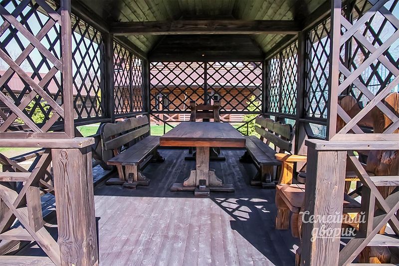Так же для каждого дома есть своя отдельная беседка и мангал. Для гостей шестиместного дома база отдыха "Семейный дворик" предоставляет дрова для первого разведения огня в мангале совершенно бесплатно.