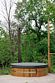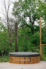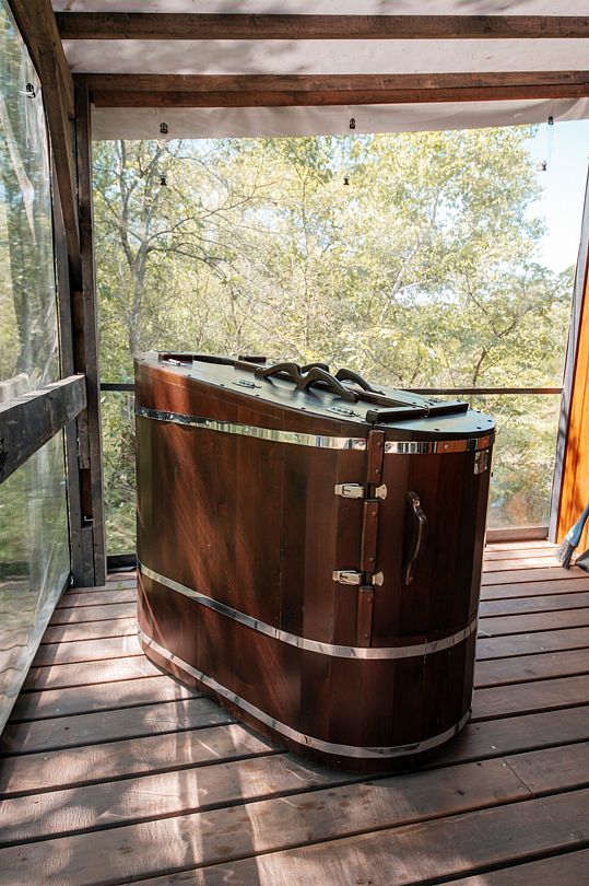 На террасе бани установлена кедровая бочка. Кедровая бочка — это не только метод оздоровления, но и удовольствие. Она представляет собой деревянную бочку, внутри которой находится горячий пар, который создается за счет нагревания воды.