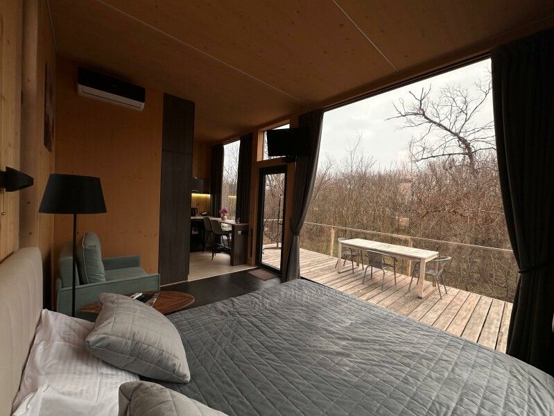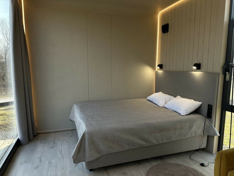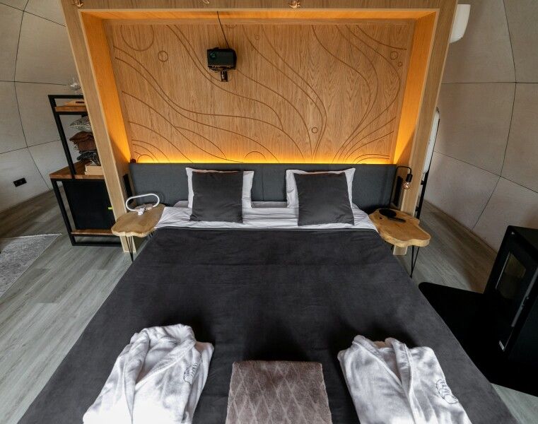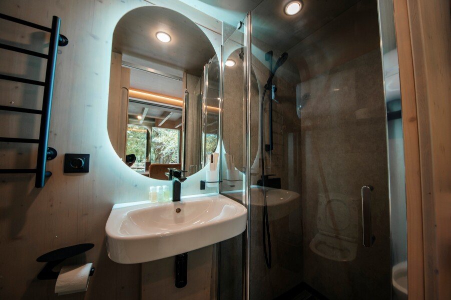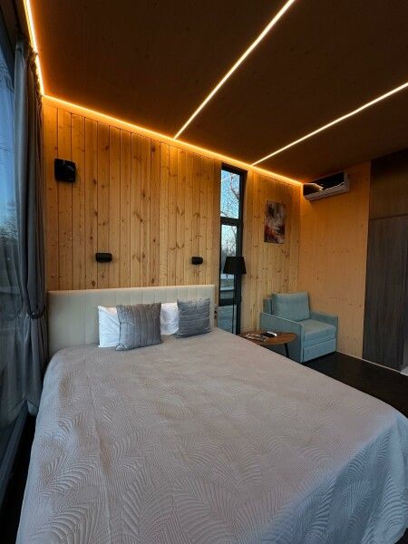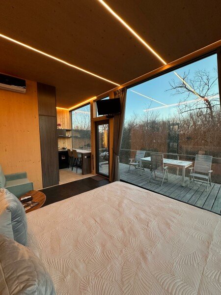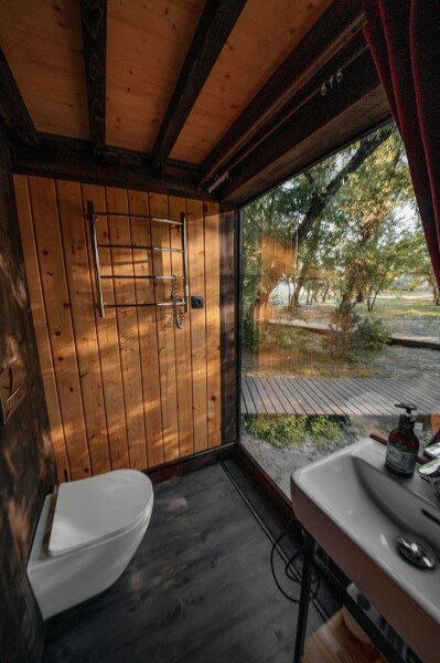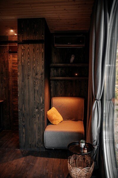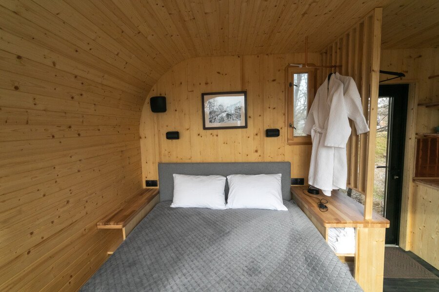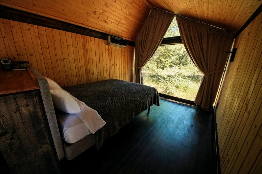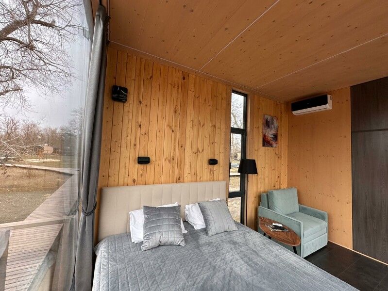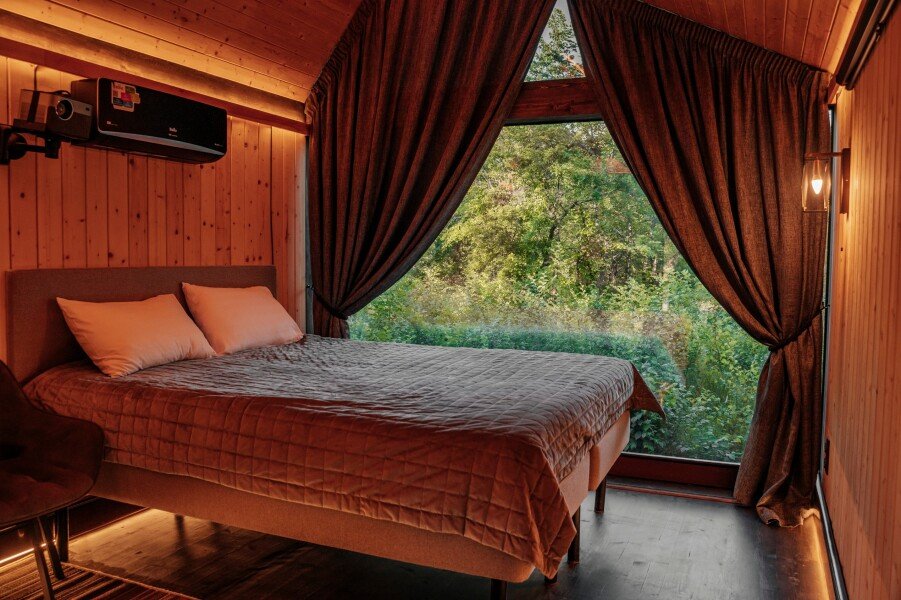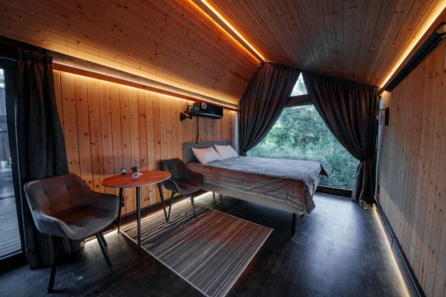 Вы поселитесь в уютных домах с панорамными окнами, откуда открываются потрясающие виды на окружающий лес и реку. В вашем распоряжении будет спутниковое телевидение для вечернего досуга и собственный банный комплекс для полного расслабления.