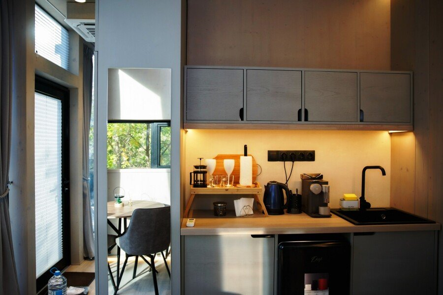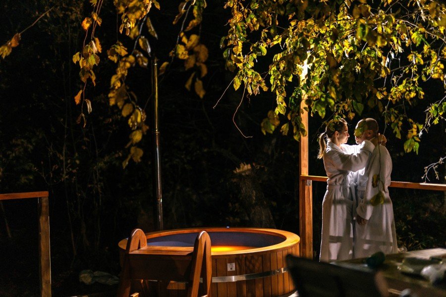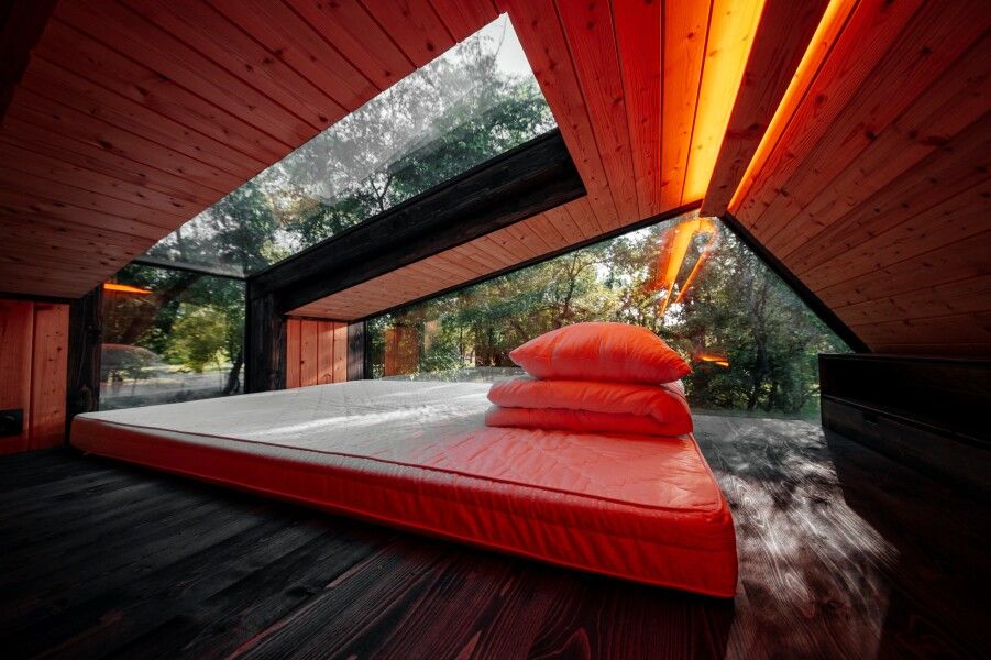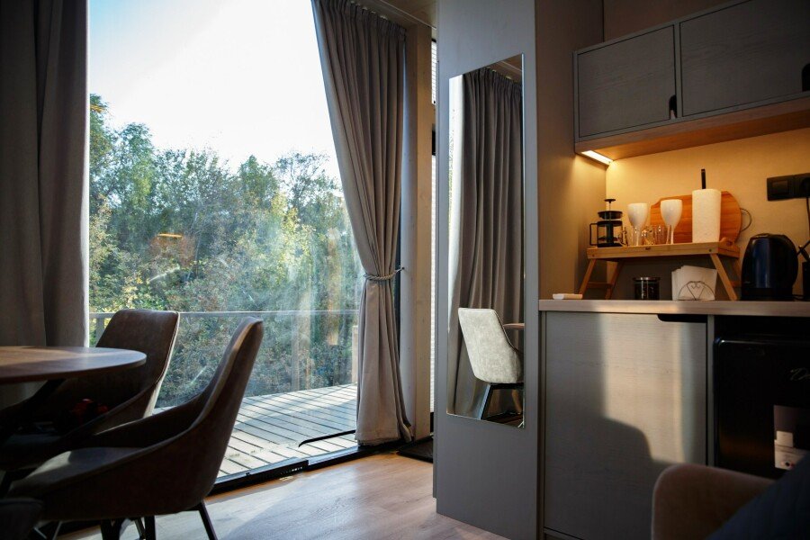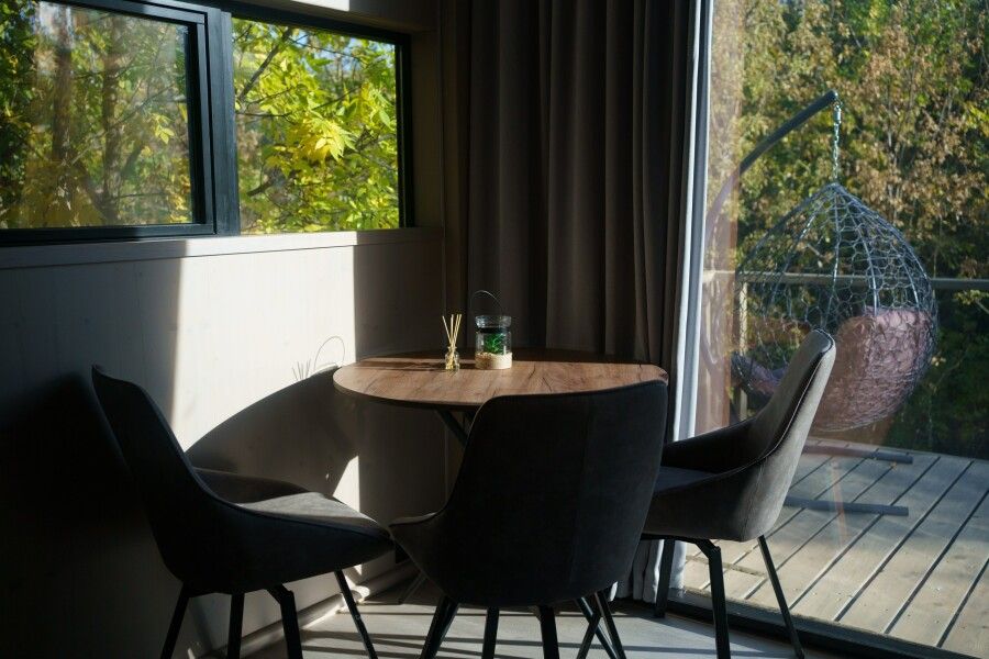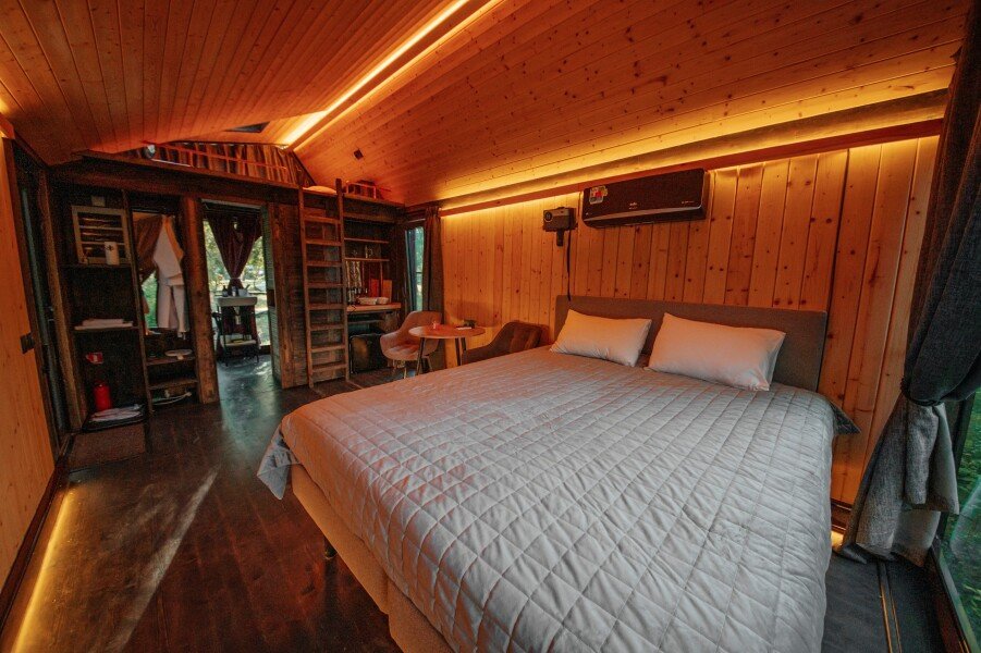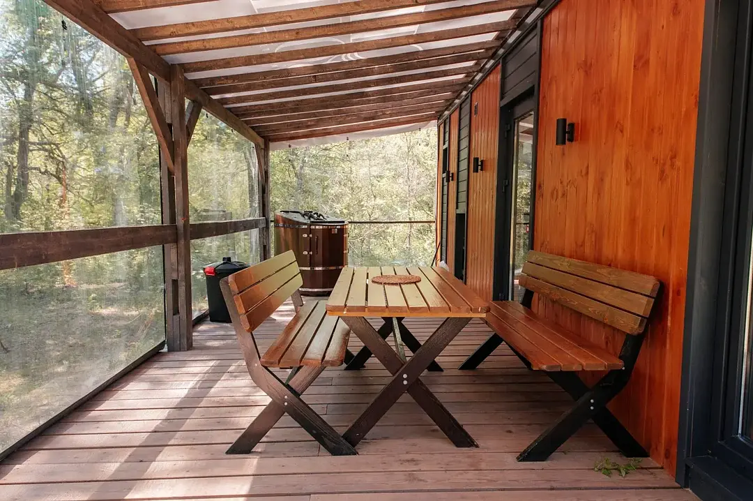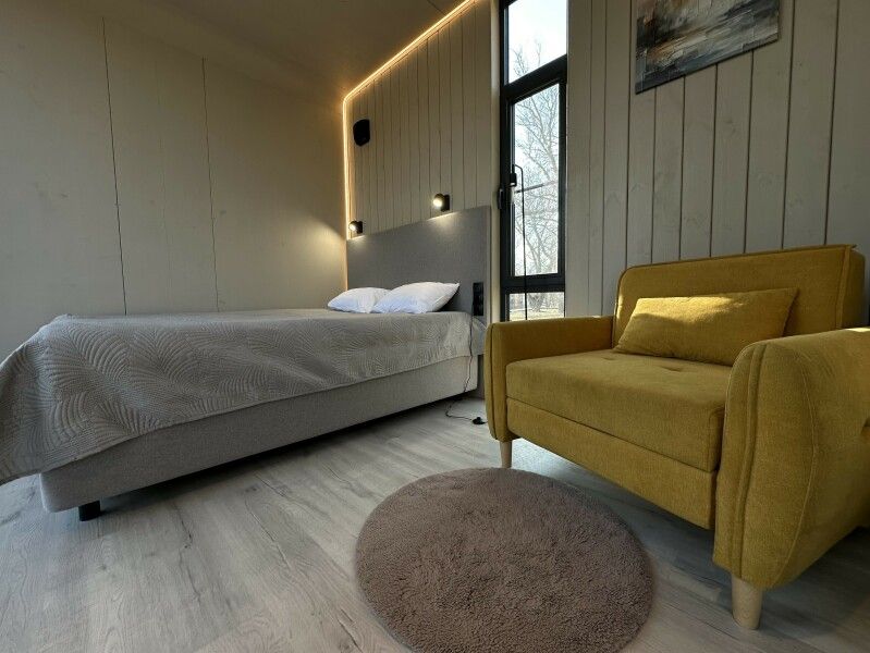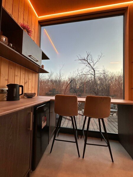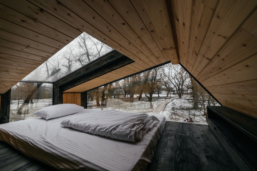 Вы поселитесь в уютных домах с панорамными окнами, откуда открываются потрясающие виды на окружающий лес и реку. В вашем распоряжении будет спутниковое телевидение для вечернего досуга и собственный банный комплекс для полного расслабления.