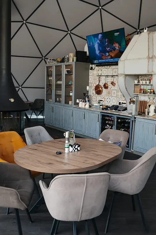 Уютный купол площадью 30 м2 с большой двуспальной кроватью и затемнёнными шторами создаёт атмосферу уединения и комфорта. Система отопления и кондиционирования включает в себя тёплый пол, сплит-систему и камин на пеллетах, который включается в зимний период.