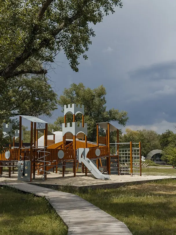 На площадке есть игровой комплекс в виде средневекового замка с тремя горками. Также здесь установлены альпинистские стенки с канатами, шведская стенка, шест-спираль и другие интересные элементы. Башни соединены между собой мостиком и тоннелями, а лазательный комплекс с сетчатыми элементами позволяет детям проявить свою ловкость и смелость.