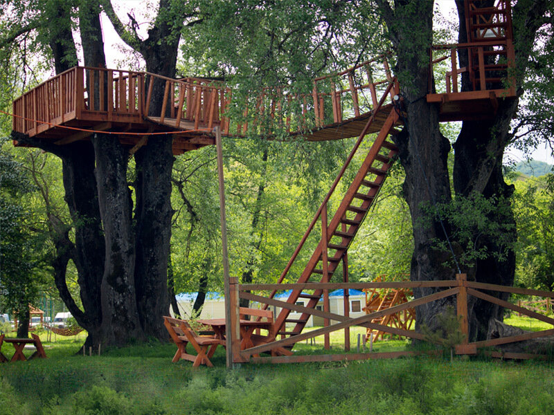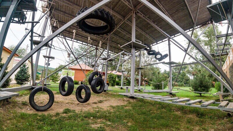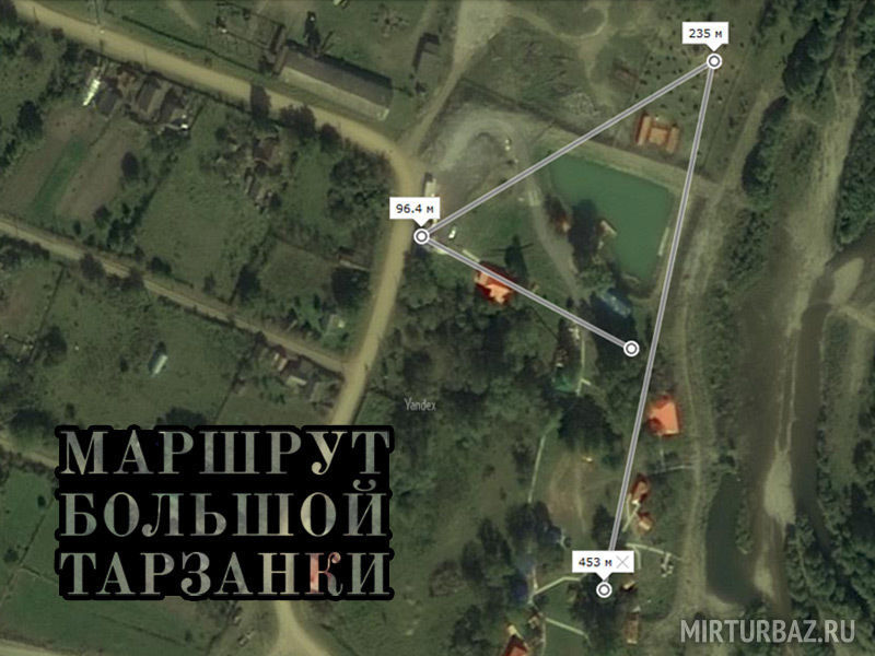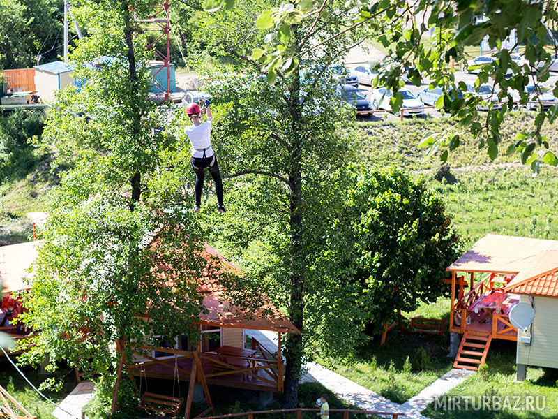 Большая тарзанка (470 метров) начинается на вершине дерева в 30 метрах от земли; первый спуск, 100 метров, приводит вас на вышку, откуда вы спускаетесь уже по более стремительному, 140-метровому маршруту на вторую вышку, далее 230 метров спуска через всю территорию комплекса.Стоимость спуска на малой тарзанке: 150₽