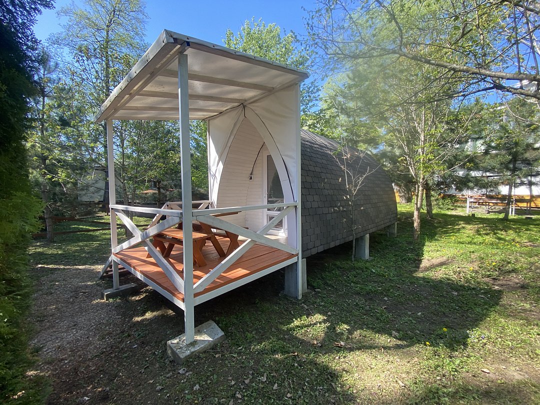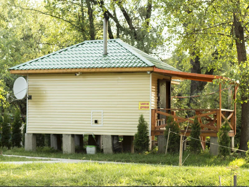 Рядом находится мангальная зона, а также зелёная полянка, на которой можно играть в футбол и другие активные игры. Гости могут пользоваться общей кухней: на ней есть плита и микроволновка, а в самом номере — чайник и холодильник.