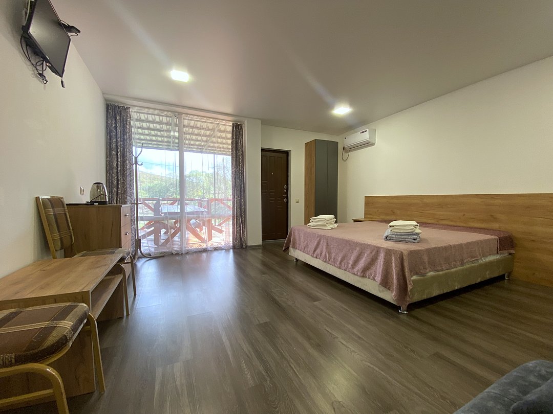 Уютный, комфортабельный вариант для отдыха семьи или небольшой компании. В номере расположена двуспальная кровать и дополнительное спальное место — удобная тумба-раскладушка, что позволяет с комфортом разместиться втроём. Есть просторная веранда, где приятно проводить время на свежем воздухе.