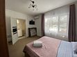 Это вариант размещения с двумя спальными зонами. В одной комнате расположена двуспальная кровать, во второй — раскладной двуспальный диван. Между комнатами нет двери, пространство разделено аркой. Душевая кабина находится прямо в спальной комнате — это отличительная особенность данных номеров.